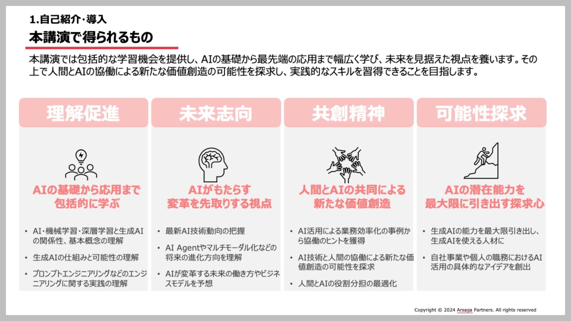 最後に、アルサーガパートナーズ代表であり、一般社団法人Generative AI Japanの理事を務める小俣の言葉を引用し、「生成AIに取って代わることのない『決断』『判断』『行動』という領域で、人間が最も価値を発揮できる領域で自分の価値を高めて行くことが重要です」と語り、セミナーを締めくくりました。