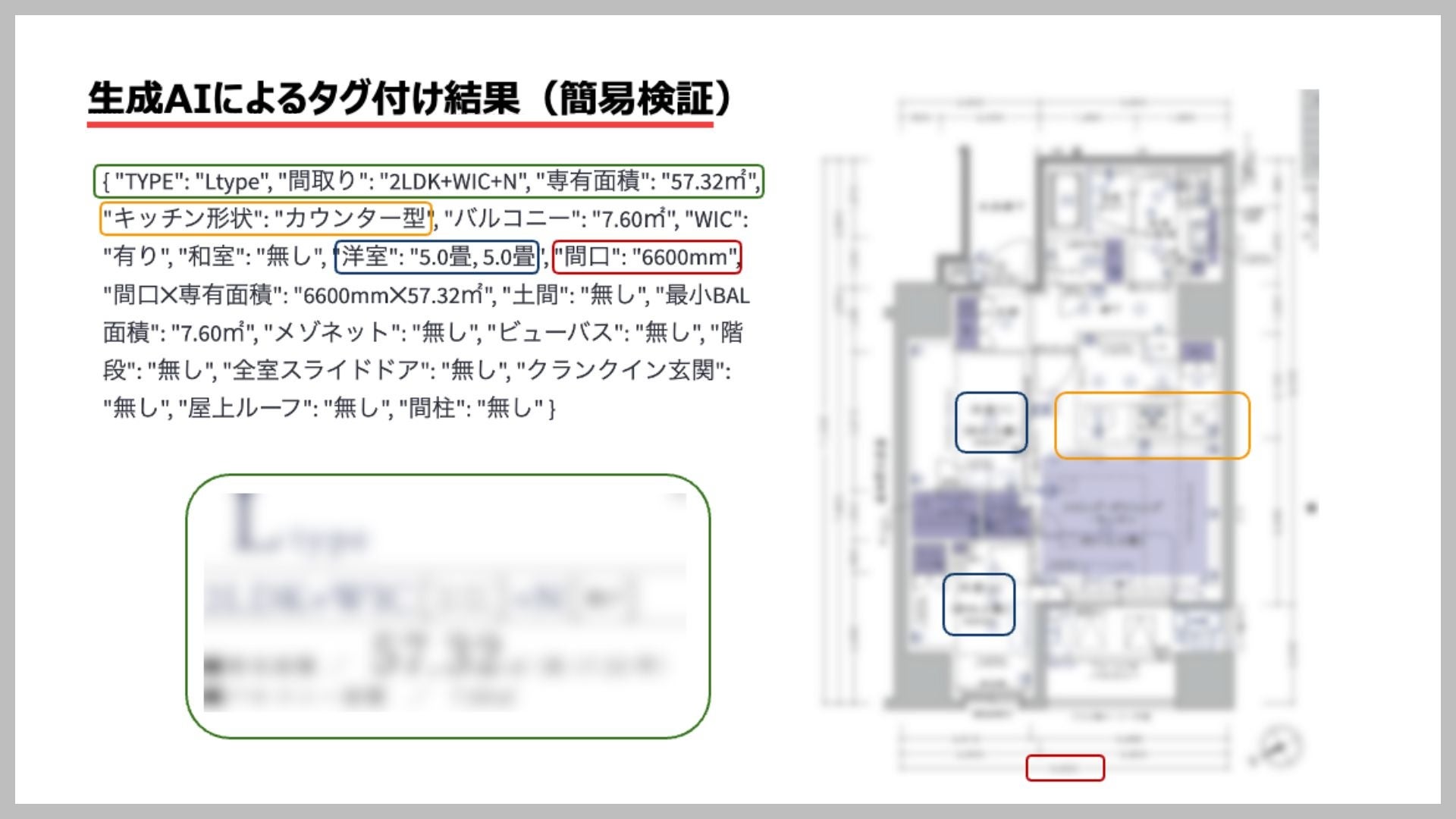 生成AIを活用したタグ付けの事例についても紹介しました。生成AIを利用することで、平面図から物件情報に関する詳細なタグを自動的に抽出することが可能です。