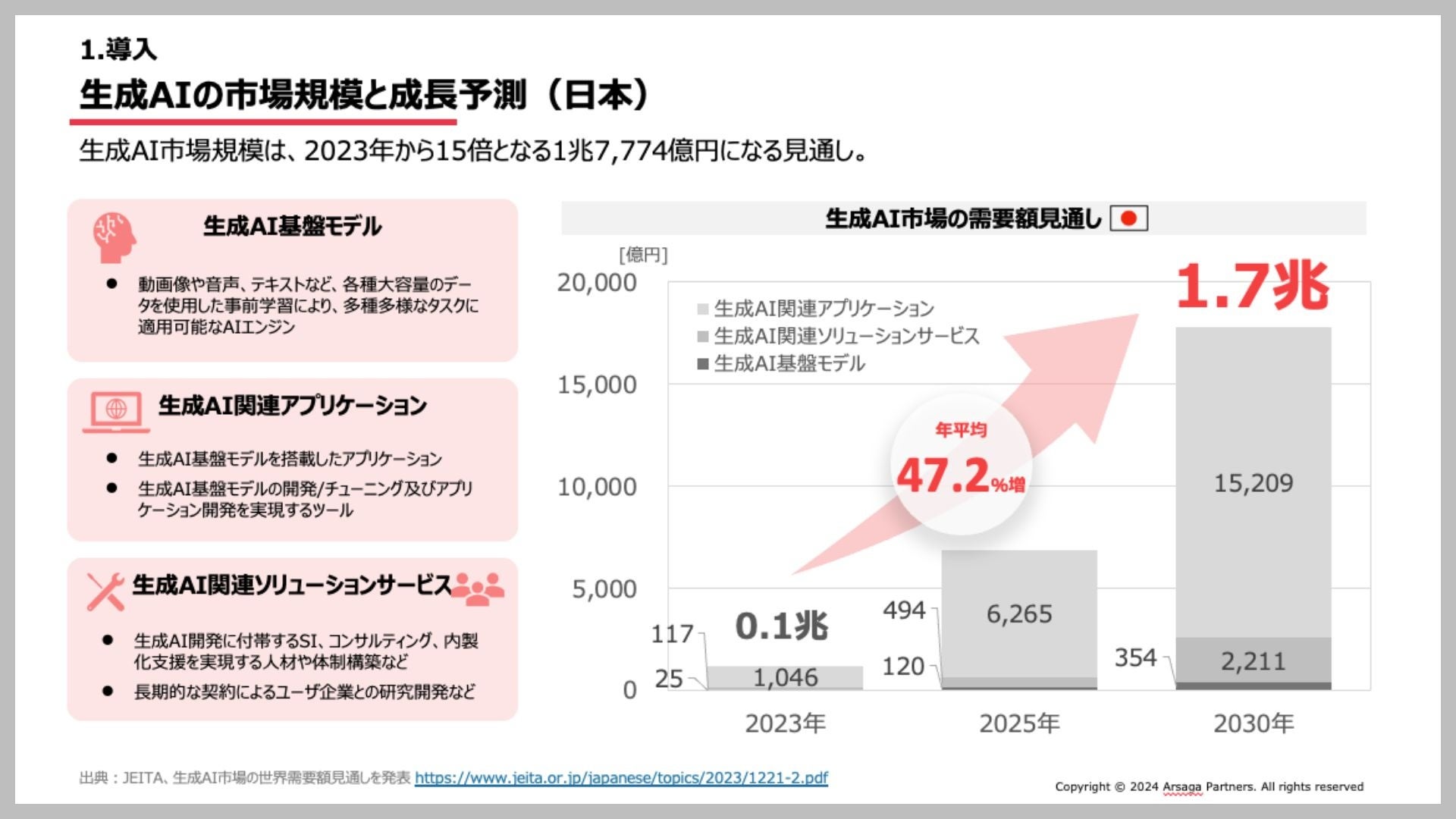 JEITAの調査によると、日本国内における生成AI市場は、今後大幅な成長が見込まれており、2023年から2030年にかけての需要額は年平均47.2%の増加が予測されています。この成長により、2030年には市場規模が1兆7,774億円に達するとされています。