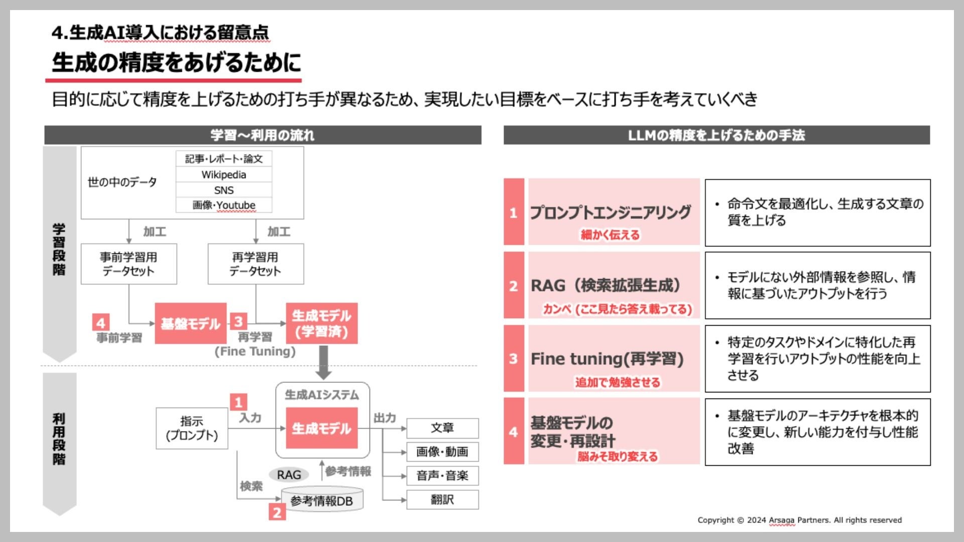 本セミナーでは、東京大学松尾・岩澤研究室の岩澤教授により、生成AIの基礎的な部分についてご講演いただきました。また、アルサーガパートナーズの横溝からは、生成AIを実務で活用する際の具体的なユースケースや事例の紹介、さらに実務において生成AIを活用する際の留意点など、ビジネス向けの視点でお話しいたしました。