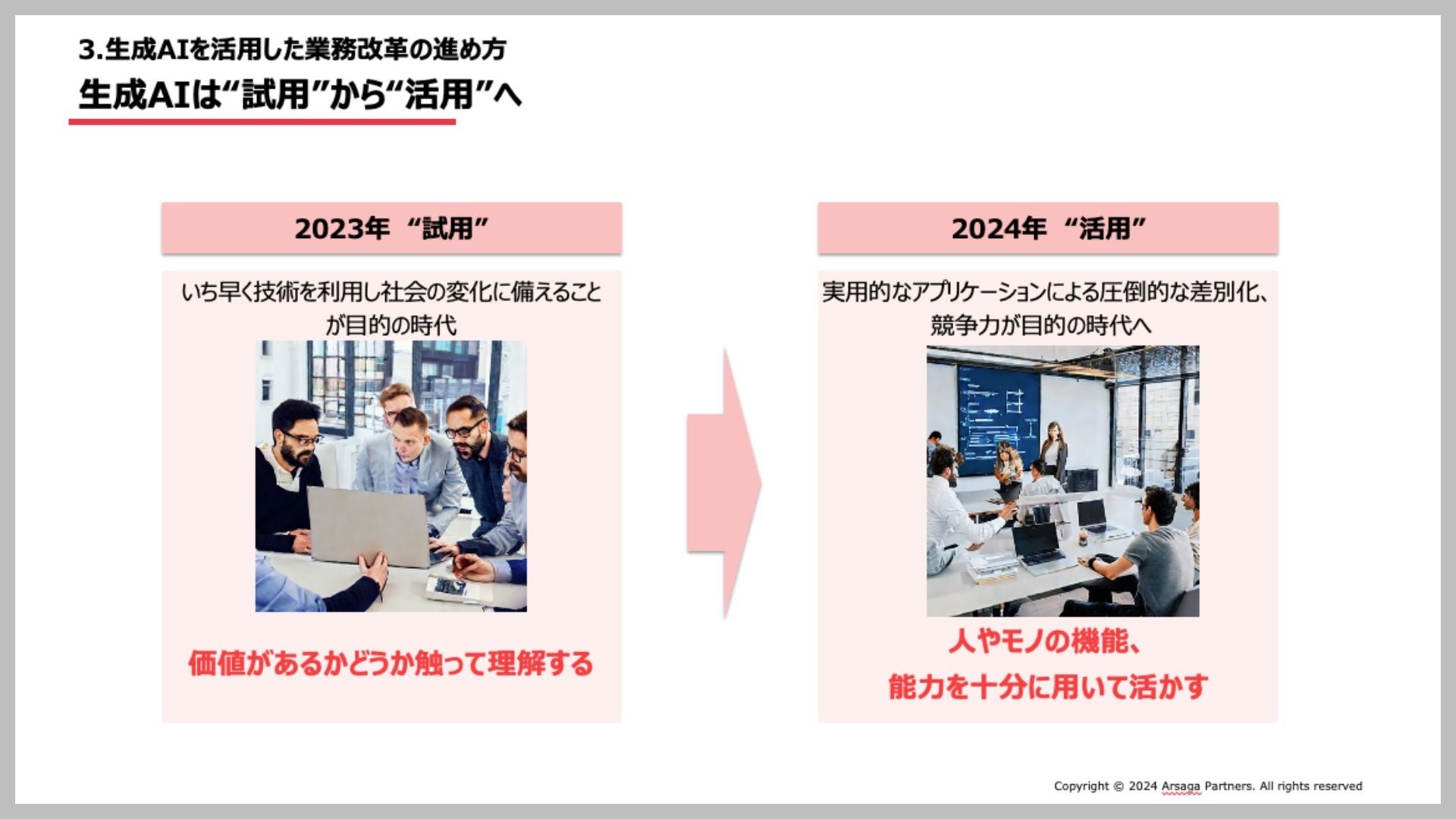 生成AIの導入は、2023年の「試用」段階から、2024年には「活用」の段階へと進化を遂げようとしています。2023年は、いち早く生成AI技術を導入し、社会の変化に備えるための試行錯誤の時期でした。この段階では、企業は新技術に触れることで、その価値を理解し、どのような効果が得られるかを見極めてきました。