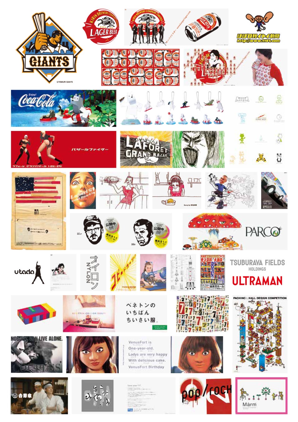 「円谷フィールズHD」「キリンラガービール」「吉野家」のブランディング・クリエイティブディレクション。「コカ・コーラ」「宇多田ヒカル」「ラフォーレ」などの広告・グラフィックデザイン。「読売ジャイアンツ」「ほぼ日刊イトイ新聞」「ヒロミチ・ナカノ」などのエンブレムマーク・ロゴマーク。「Copet」「カミロボ」「ハットトリックス」「にじぞう」のキャラクタープロデュース等、多数。