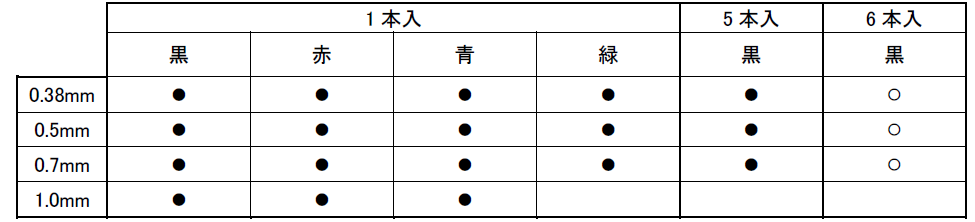 インク色:黒、赤、青、緑(1.0㎜は黒、赤、青のみ)