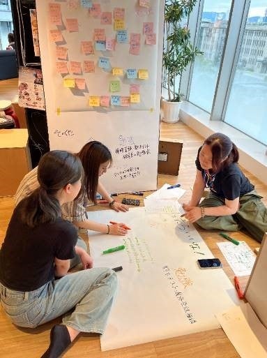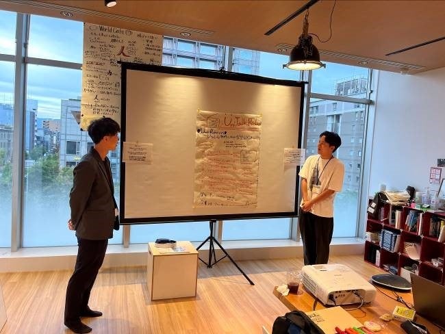 グループワークでは、課題の設定を行い、アイデアブレストに取り組んでいきます。ときには意見を出し合い、ときには私達に意見を求めながら、多くのアイデアが出てきました。それらを纏め、全体像を固めながら大きな模造紙に書き込んでいきます。検討した提案内容についてプレゼンテーションがあり、当社からもフィードバックを行いました。