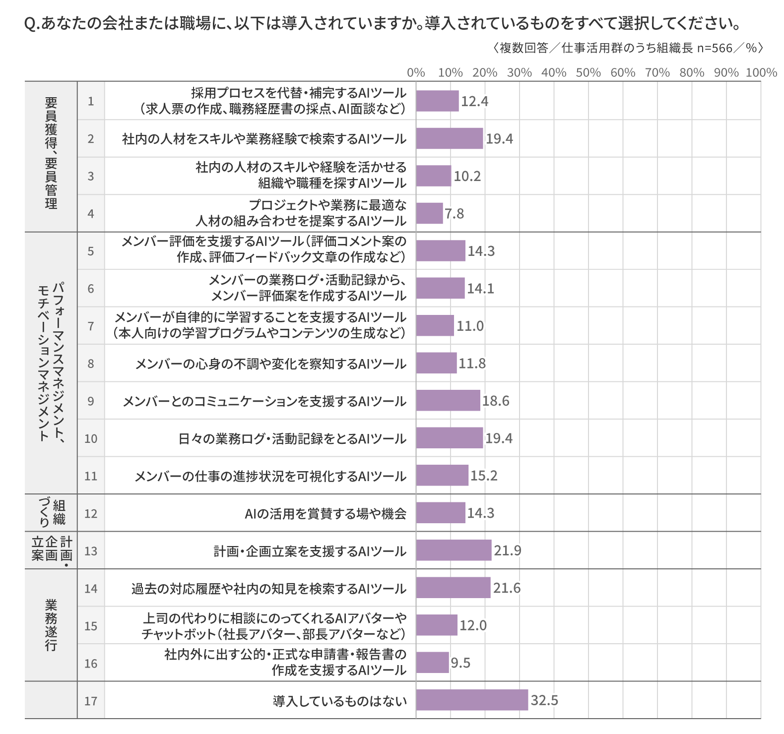 ・勤務先の会社や職場に導入されているAIツールについて、仕事活用群のうち組織長に尋ねた。AIツールを「導入しているものはない(17)」は32.5%である一方、何らかのツールを導入している企業は67.5%と、導入の裾野は広がりつつある。