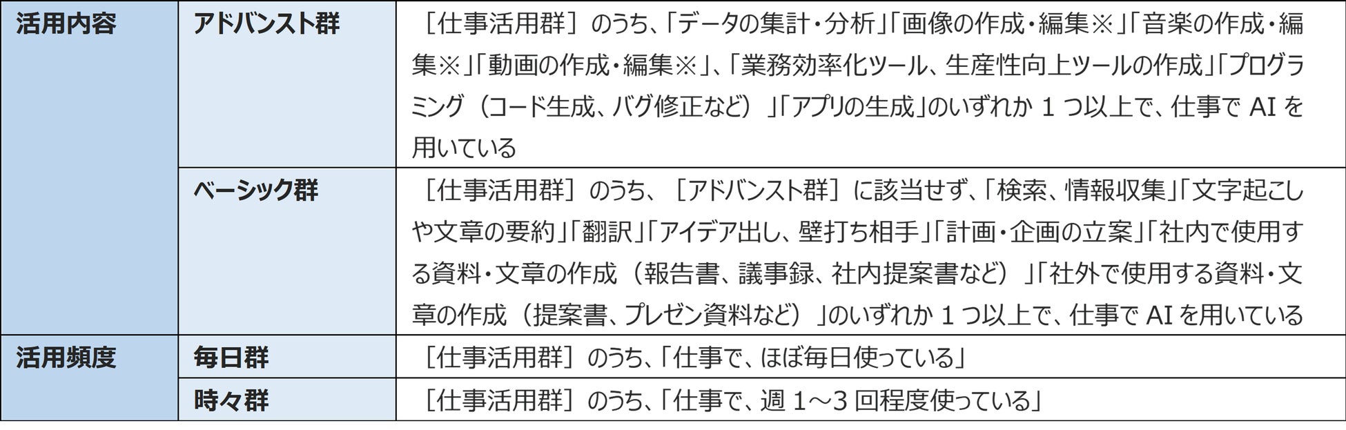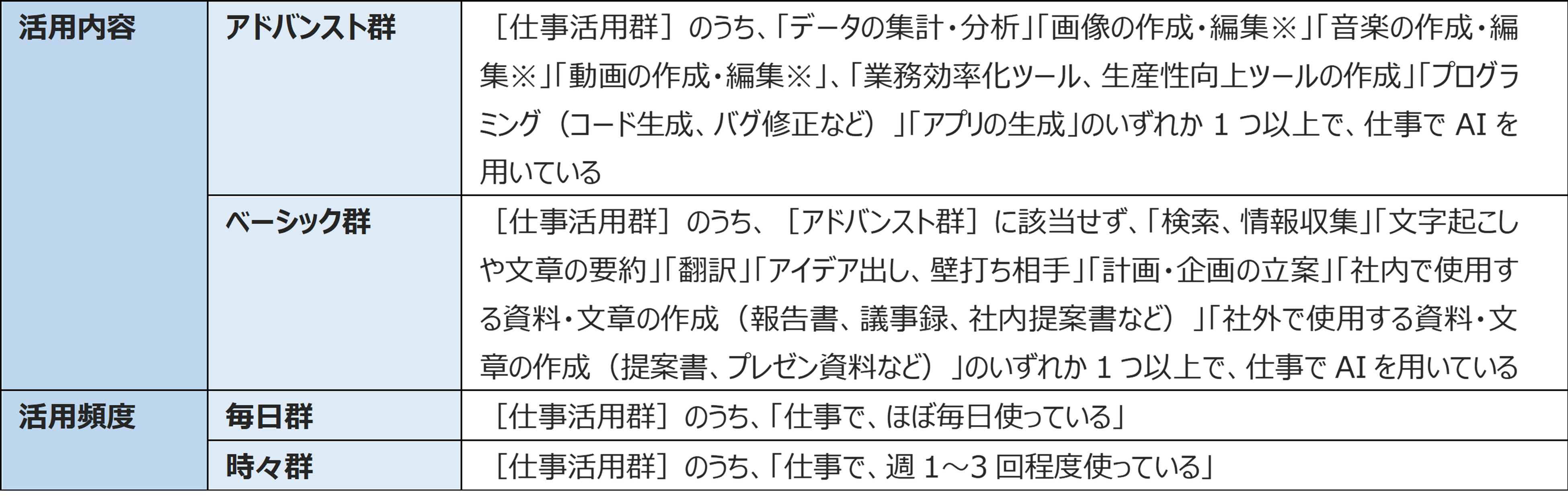 ・仕事活用群:AIの活用状況が、「仕事でほぼ毎日使っている」「仕事で週1~3回程度使っている」の選択者