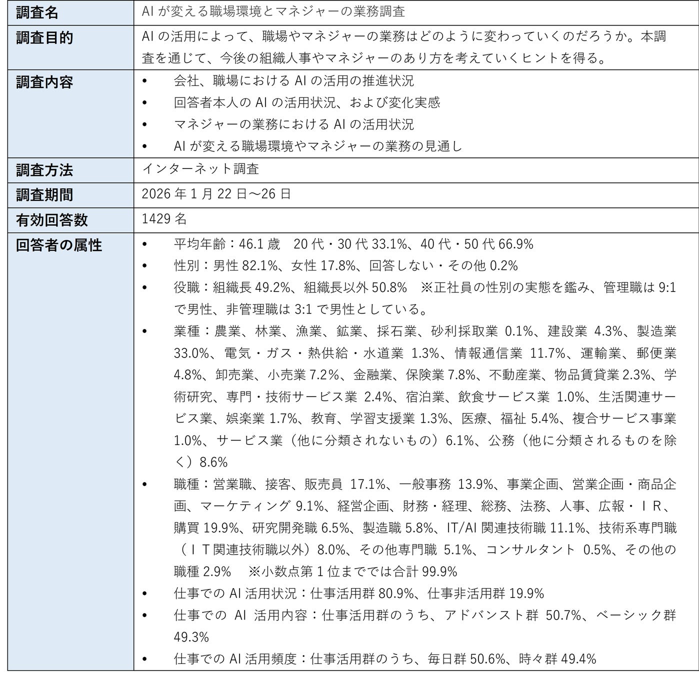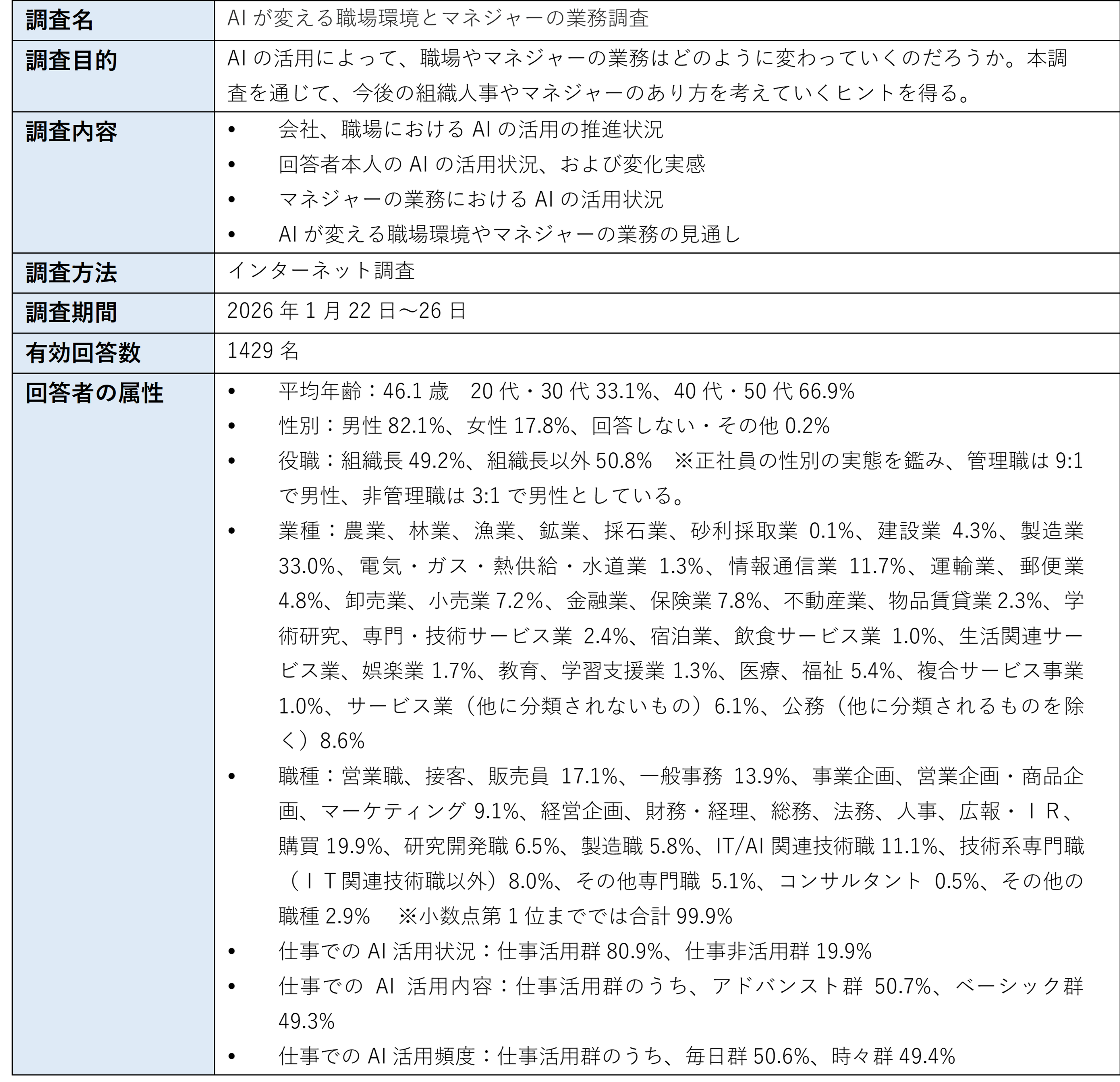 商品・サービス、業務プロセスといった事業におけるAI活用に関するニュースを日々見聞きします。また、働く人のAI活用も進み、職場やマネジメント業務にも変化が表れてきている状況を受けて、本調査を実施しました。