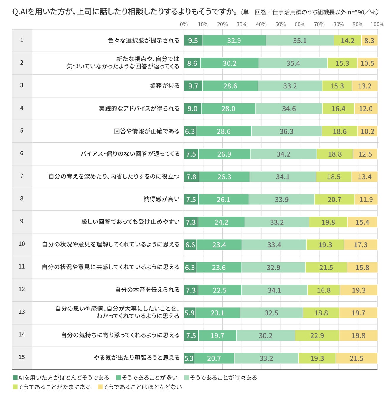 ・一方で、「やる気の喚起(15)」はAIの肯定回答率が26.0%に対し上司40.8%、「気持ちへの寄り添い(14)」はAI 27.2%に対し上司42.7%、「価値観や感情の理解(13)」はAI 29.0%に対し上司38.5%と、感情や内面への関与では上司が上回る結果となった。