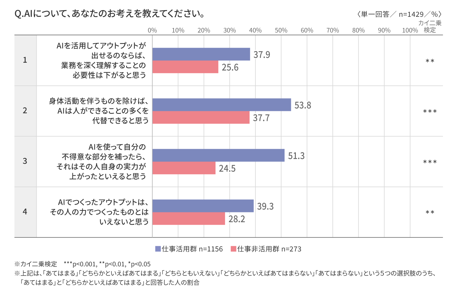 ・一方で、「AIで作成したアウトプットは本人の力とはいえない(4)」は仕事活用群で39.3%と、一定数がAI活用と本人の実力を区別して認識している。