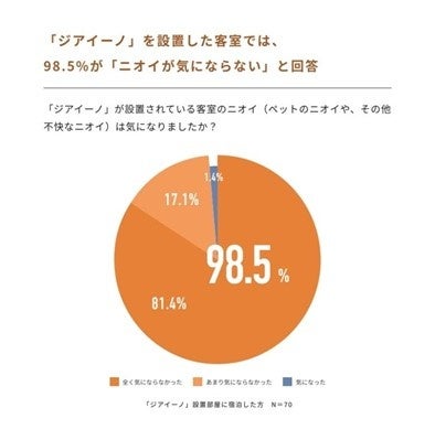パナソニック「ジアイーノ」が設置された部屋に宿泊した人に、客室のニオイについて聞くと「全く気にならなかった(81.4%)」「あまり気にならなかった(17.1%)」となり、全体の98.5%がパナソニック「ジアイーノ」が設置された客室ではニオイが「気にならない」と回答しました。また、「ペットの臭いを感じず、快適に宿泊でき、何より我が家のワンチャンが快適に過ごせて満足」「ホテルに入った際の心地よさがあり、ニオイに対して非常に満足」などの意見も寄せられ、「ジアイーノ」を導入することで、宿泊滞在に対する満足度が高まったことがわかりました。