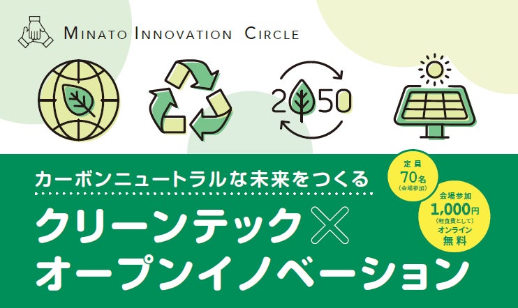 港区立産業振興センター(所在地:東京都港区)では、2月7日に「"MINATO Innovation Circle" カーボンニュートラルな未来をつくる クリーンテック×オープンイノベーション」をハイブリッド開催いたします。脱炭素に向けた事業を推進・支援してきた各社(機構)によるパネルディスカッション・環境スタートアップ5社によるピッチを通して、脱炭素問題とこれらを解決するビジネスのこれから・企業間連携による共創の可能性などを考えます。また、終了後は交流会(※)を行い、来場者と事業者間の新たなビジネス連携のきっかけを創出します。※会場参加のみ