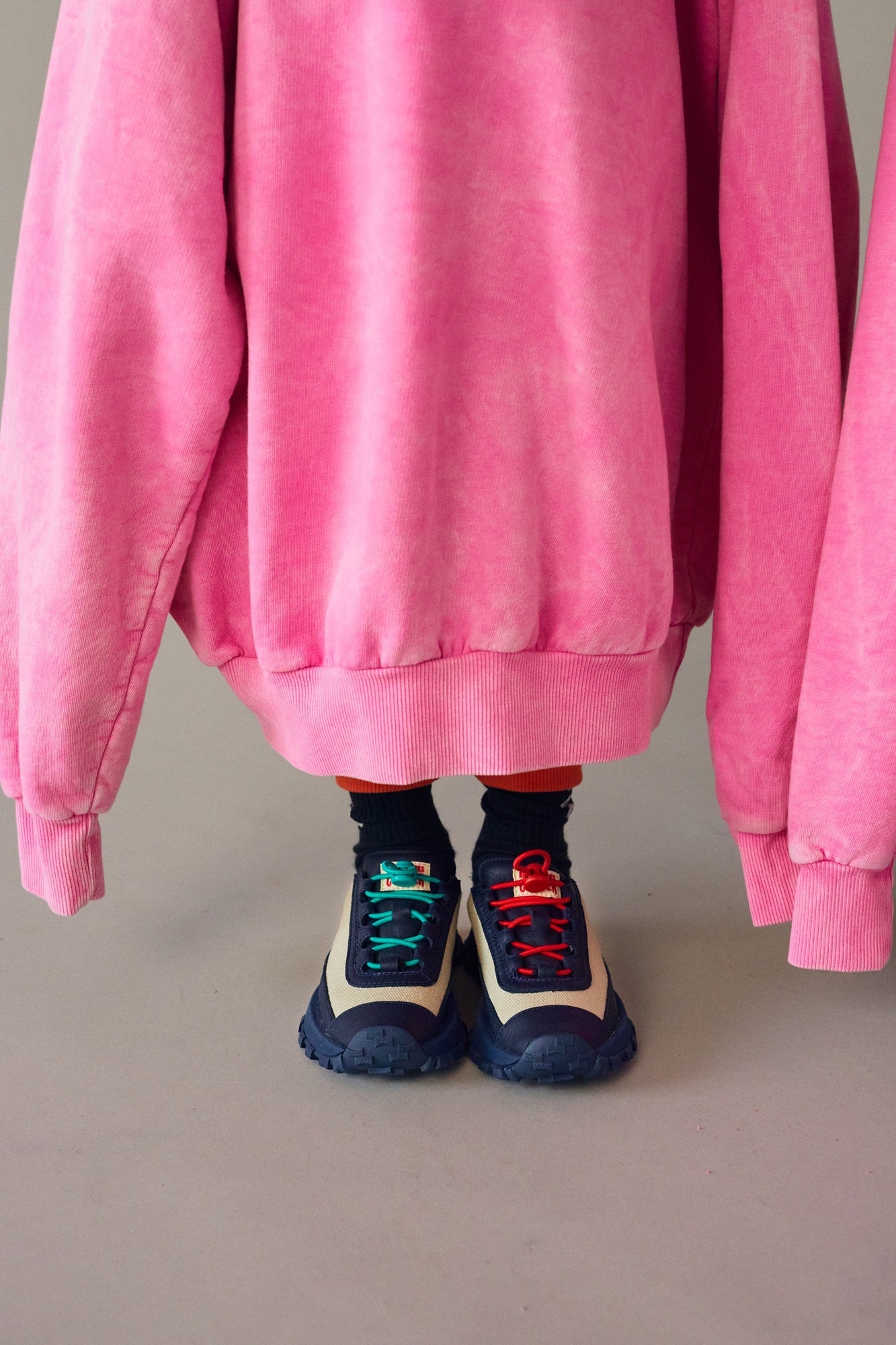 両ブランドのアイデンティティを活かした本コラボレーションは、「Different is fun.」をテーマに、左右アシンメトリーなデザインのカンペールのアイコニックシリーズ「TWINS(ツインズ)」を再構築し、大胆な色彩・コントラストを効かせた素材、そしてクラシックとコンテンポラリーを融合しました。両ブランドに共通する遊び心あふれるスピリットを反映し、スニーカー2型、ボートシューズ1型、うち1型はファーストウォーカーを含むサンダル2型を展開。