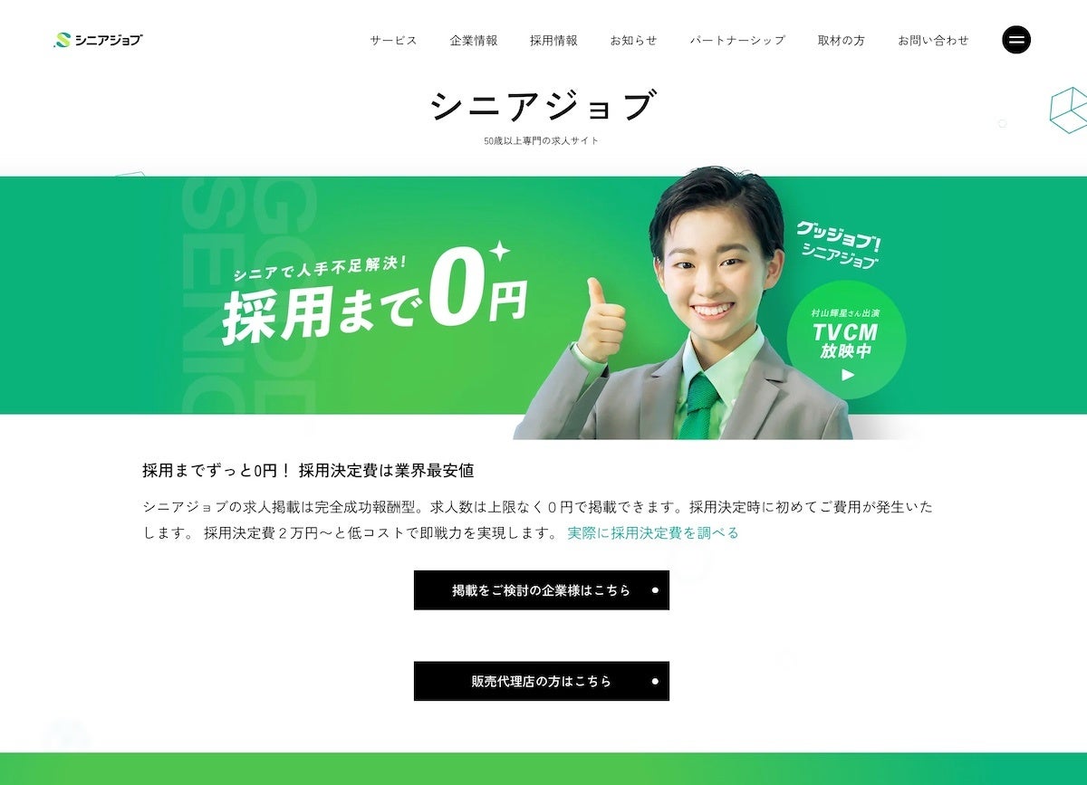 初期費用、月額費用が不要で、採用決定時に初めて費用が発生し、求人を何件掲載しても費用が発生しない完全成功報酬型の、50歳以上のシニアに特化した求人サイトです。