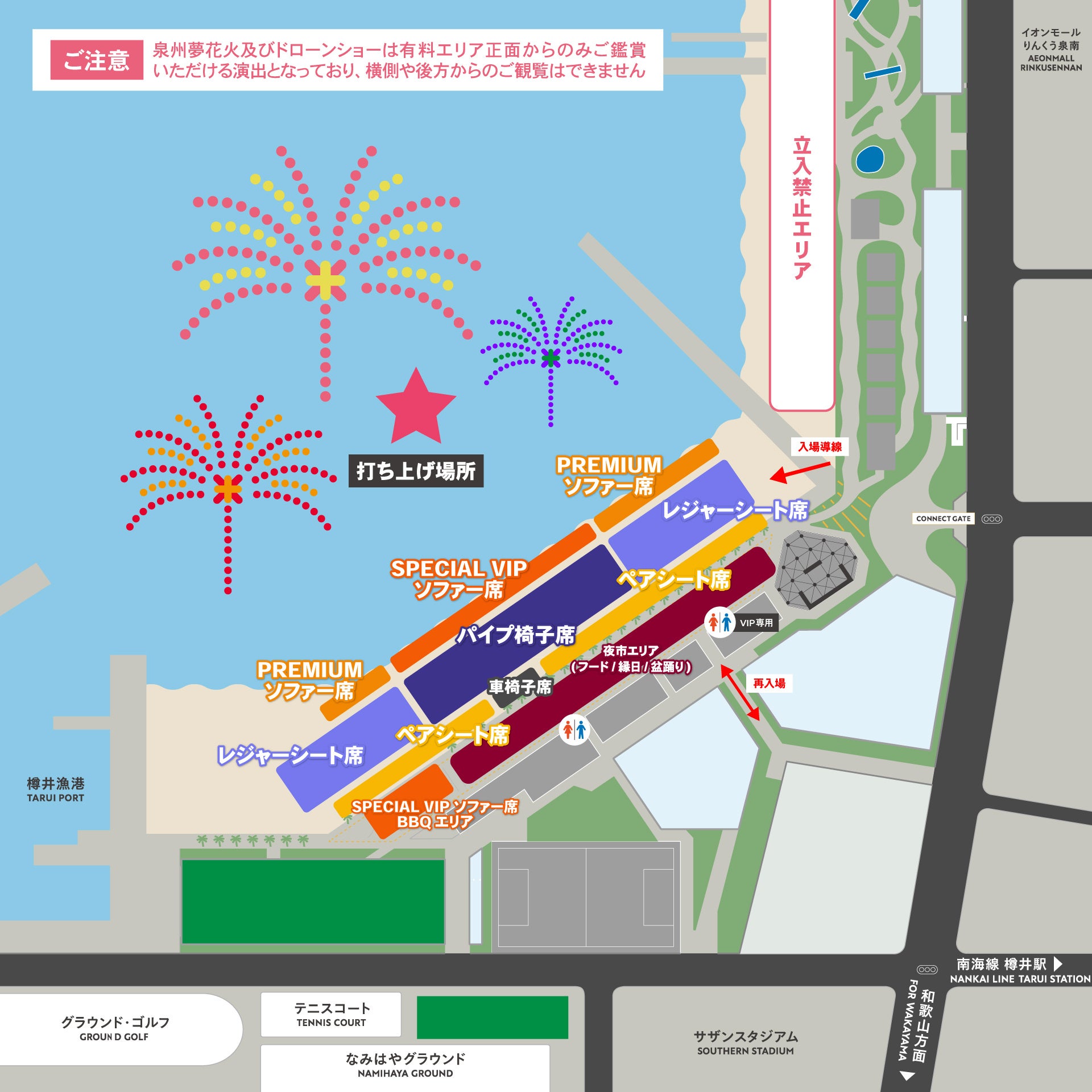 ご注意:泉州夢花火及びドローンショーは有料エリア正面からのみご鑑賞いただける演出となっており、横側や後方からのご観覧はできません。