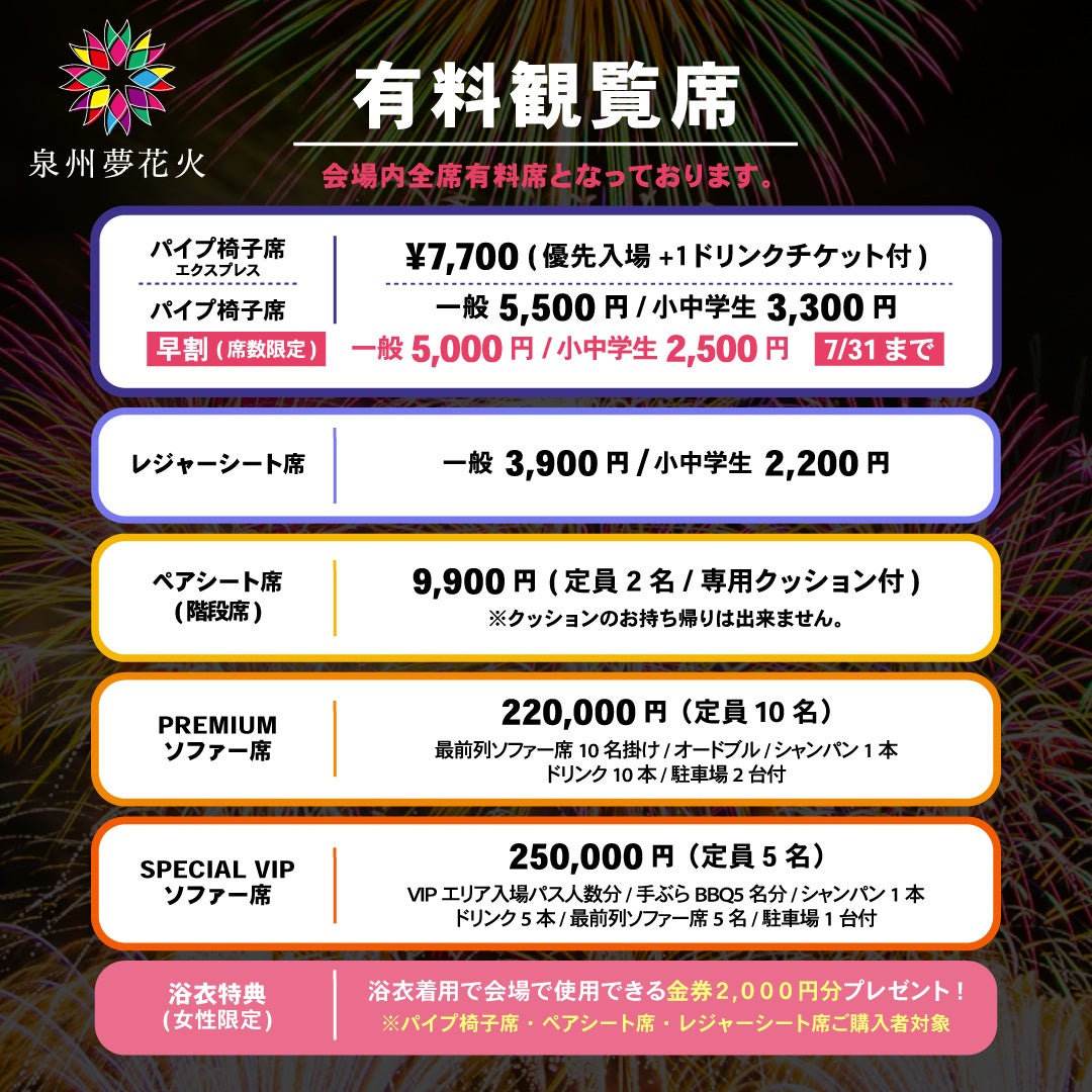 【大阪泉南】感動と興奮の饗宴、泉州夢花火 有料観覧席の席種を発表!楽天チケットにて7月20日(木) 10:00より先行発売開始!