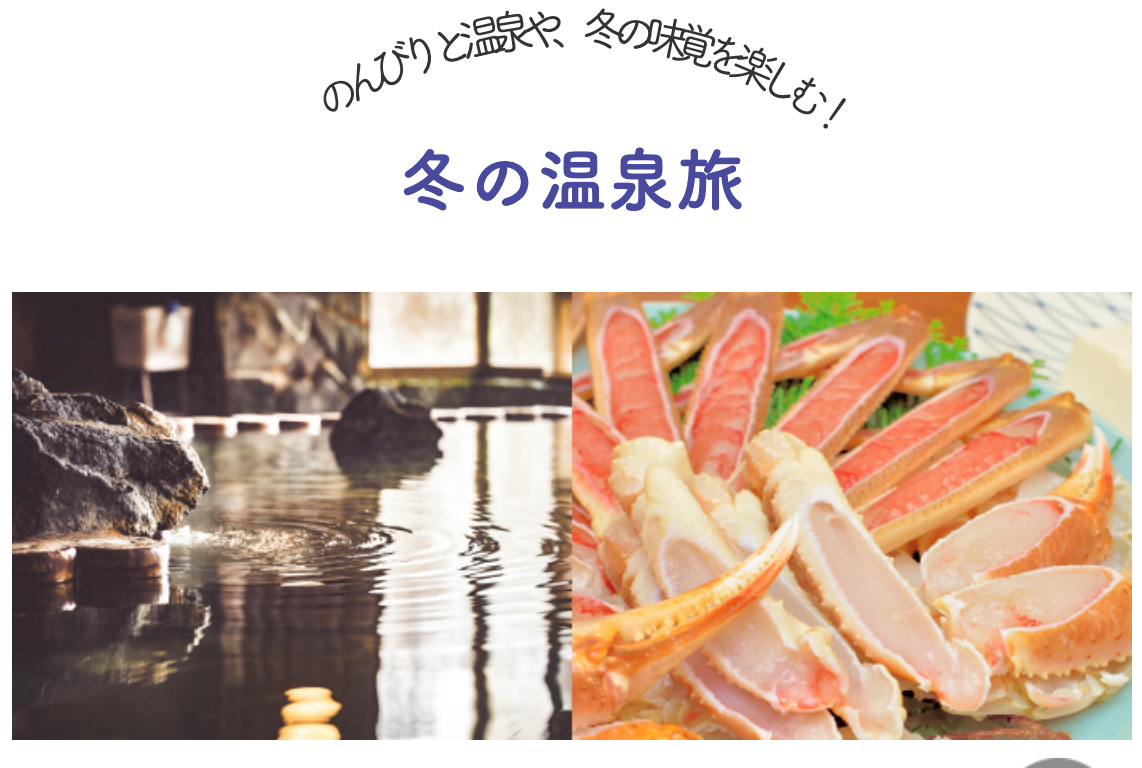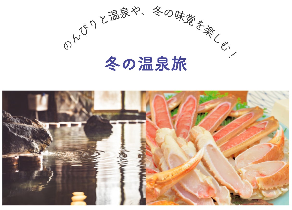 冬といえば温泉!自然の景色を眺めながらあったか〜い温泉にゆったり浸かる贅沢の時間。温泉に癒された後は冬の味覚の王様“カニ”を。冬を満喫するにはこれで決まり。