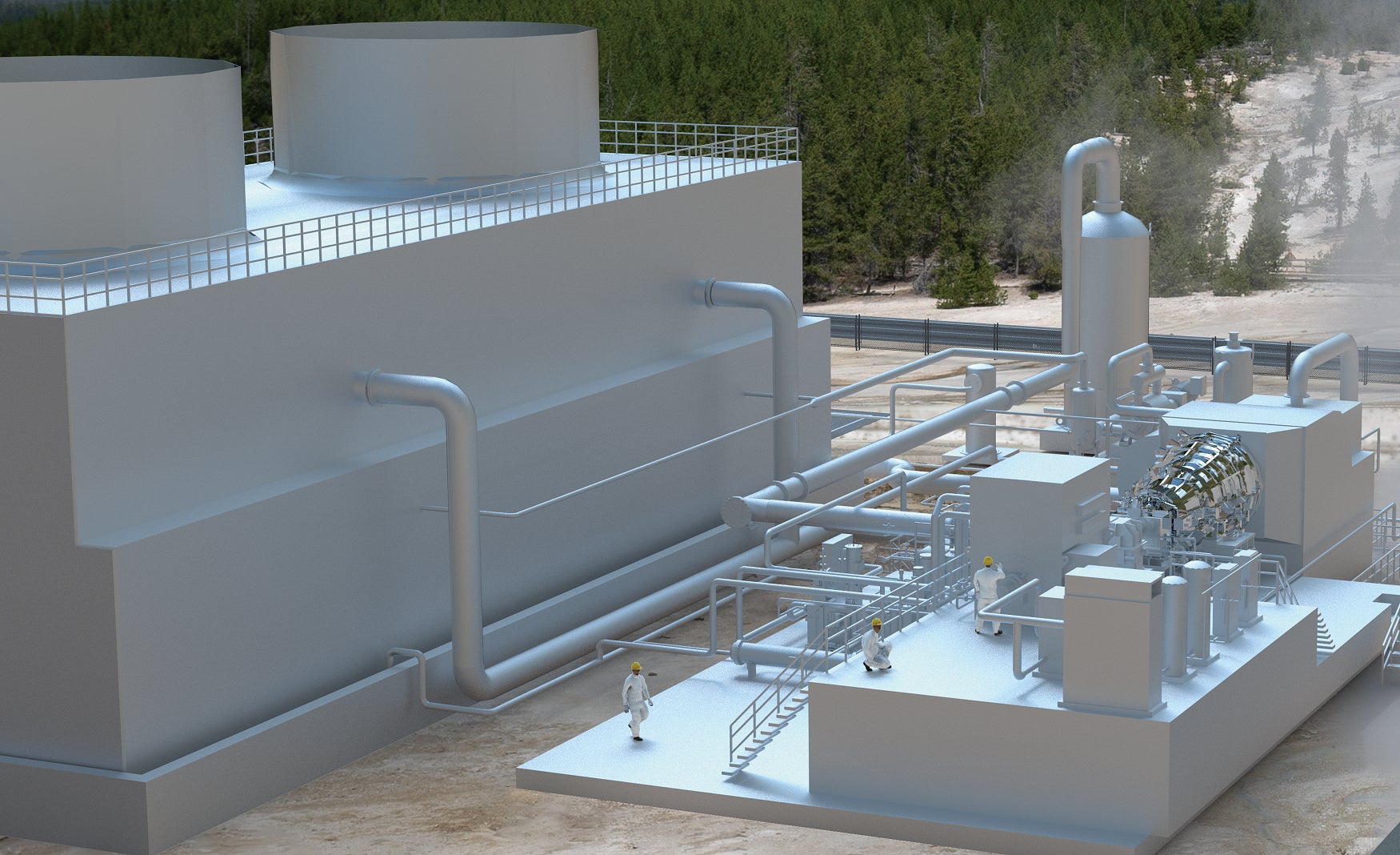 当社供給範囲:地熱発電用の蒸気タービンおよび発電機「Geoportable™」(GXP-X)20MW 1セット、冷却塔、主変圧器などの地熱発電設備一式