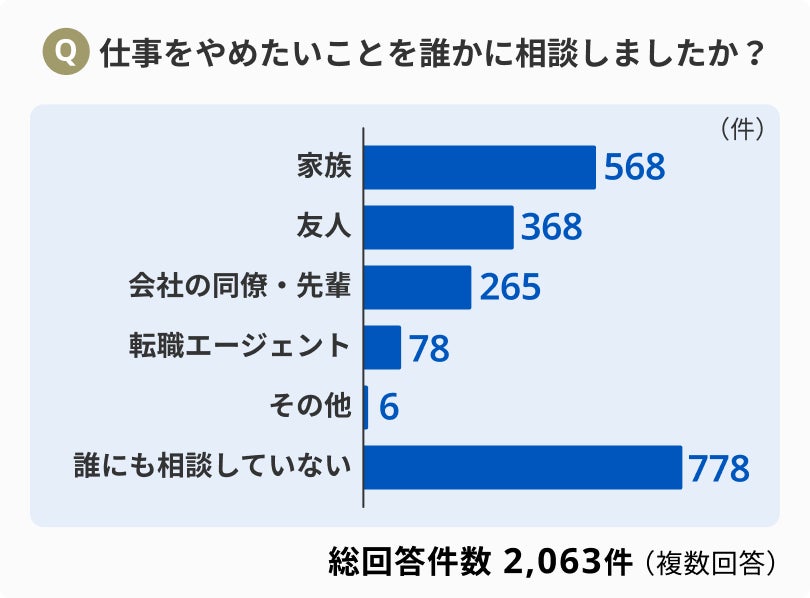 仕事をやめたいと思ったことがある人のうち、半数以上が「誰にも相談していない」と回答。