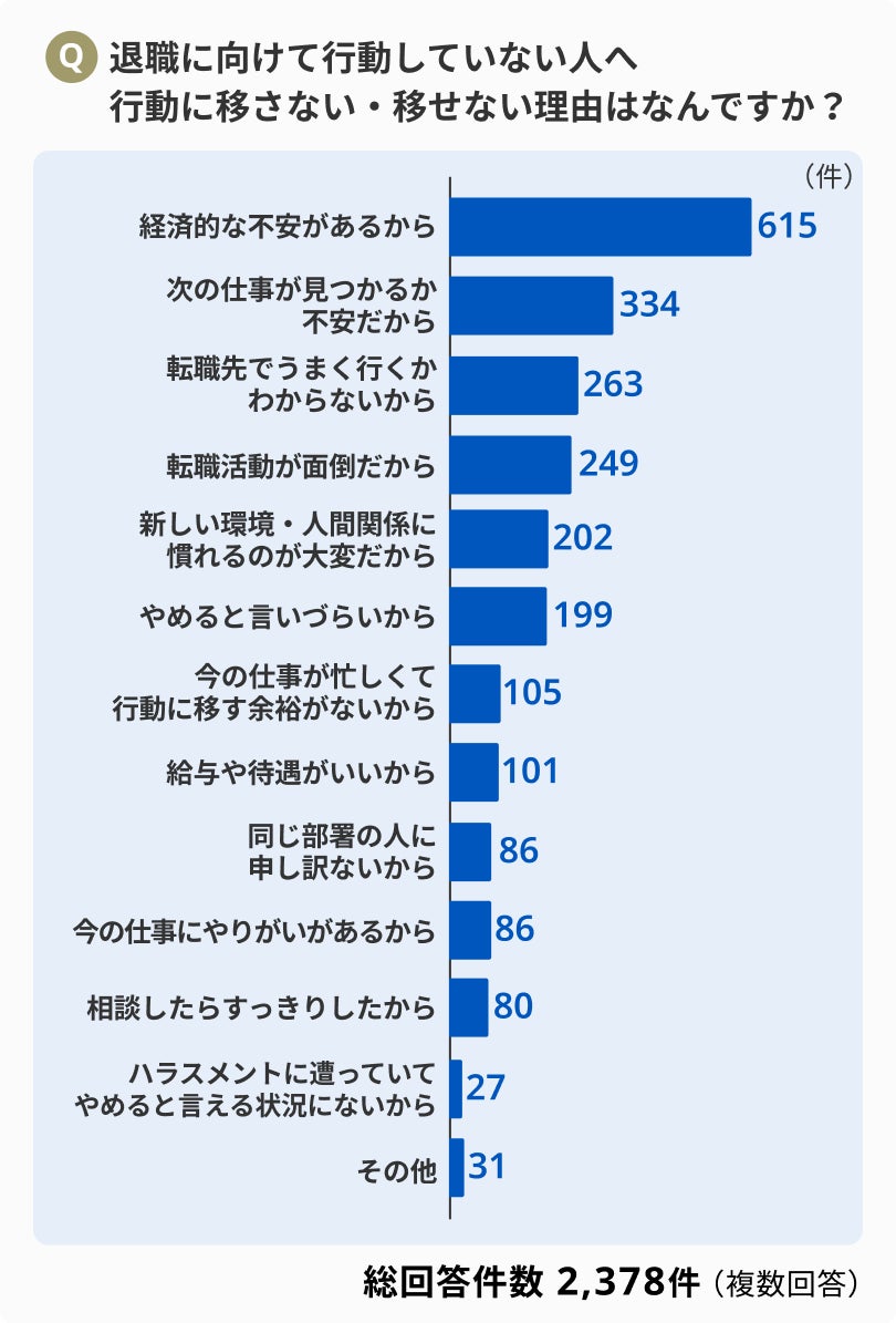 退職に向けて行動をしていないと回答した方1,161人に対して、その理由を伺ったところ、「経済的な不安があるから」が最多となり、回答件数は半数以上の615件にのぼりました。