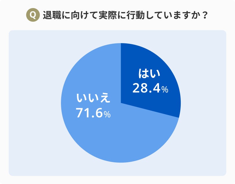 続いて仕事をやめたいと思ったことがあると回答した人に「退職に向けて実際に行動していますか?」と質問したところ、「はい」と回答した方は28.4%に留まり、71.6%は退職に向けた行動がとれていないことがわかりました。