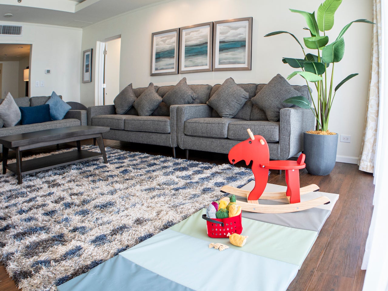 「キッズウェルカムプラン」を利用すれば、見た目にも楽しい、海外ならではのお菓子「ウェルカムおやつセット」を用意。また、リビングにはキッズスペースを設置し、部屋の中でも子どもが退屈せずに過ごせます。そのほか、リゾート気分を盛り上げる「キッズアイランドウェア」の貸出や、「キッズルームキット」(ベッドガード、プレイマット、踏み台、補助便座)を常備しています。