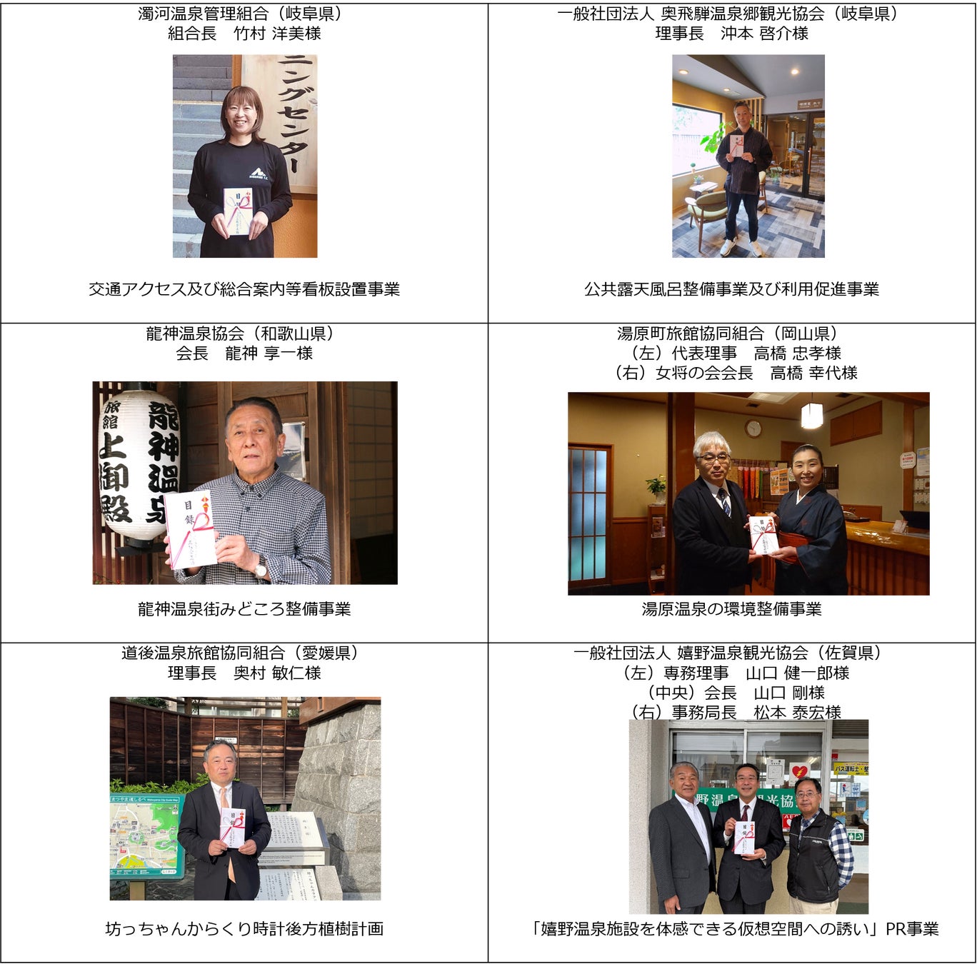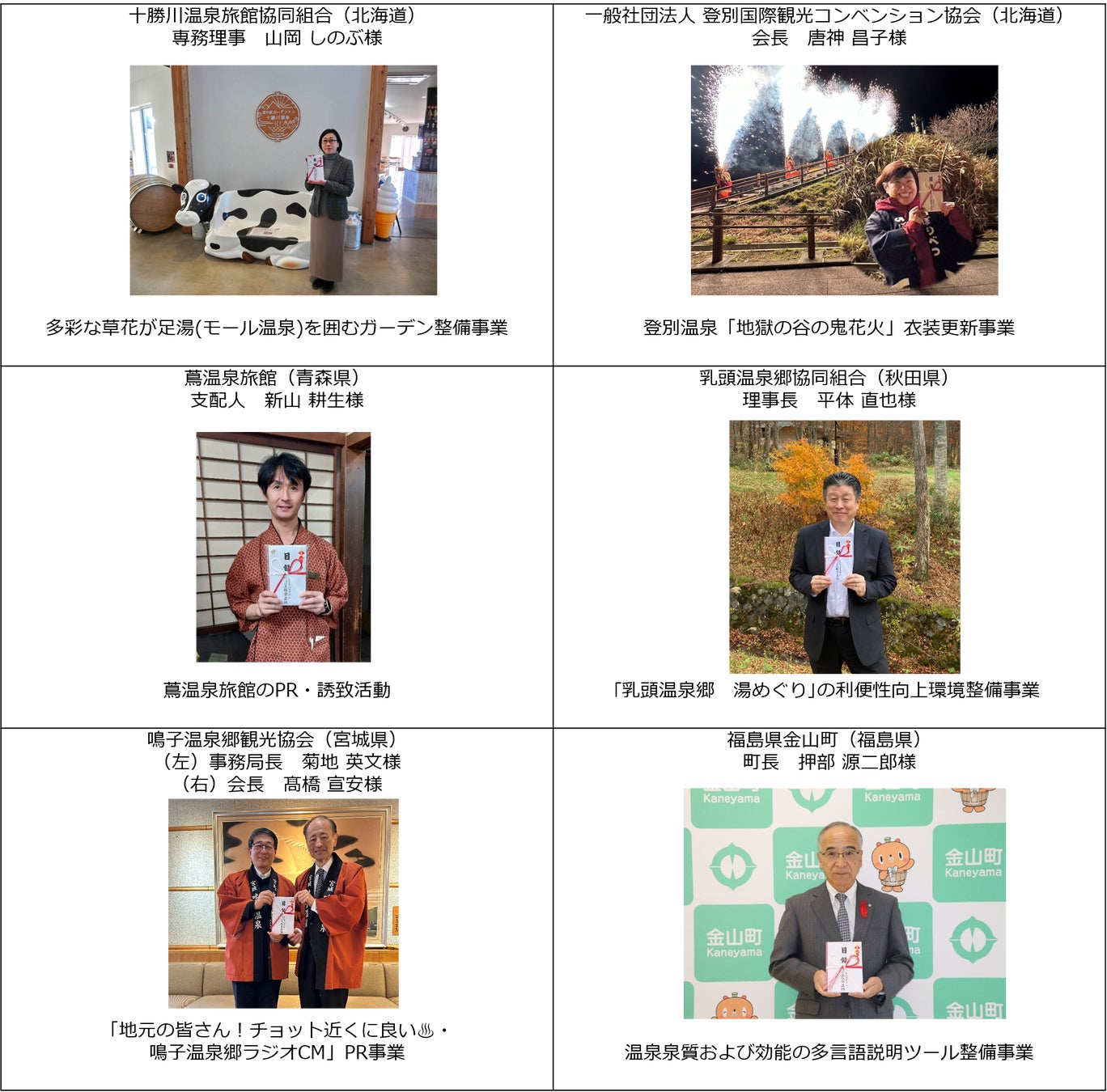 【「日本の名湯」ご公認団体贈呈の様子と各温泉地のアクションプラン・テーマ(順不同)】