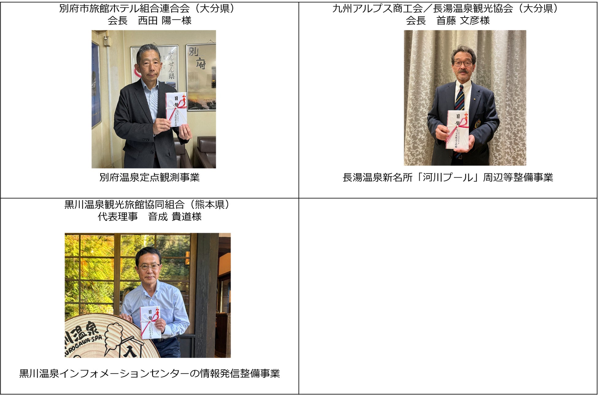 「この度の寄付金、誠にありがとうございます。長湯温泉の周辺整備のアクションプランに活用させていただきます。長湯温泉は、これからも稀有な炭酸泉を皆様にご提供し、健康で豊かな生活をお届けしたいと思います。」(九州アルプス商工会・長湯温泉観光協会 会長 首藤文彦様)