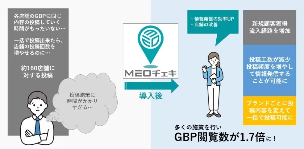そんな中、MEOチェキを導入することで、Googleビジネスプロフィールの運用時間を大幅に削減できただけでなく、集客数向上も実現しています。