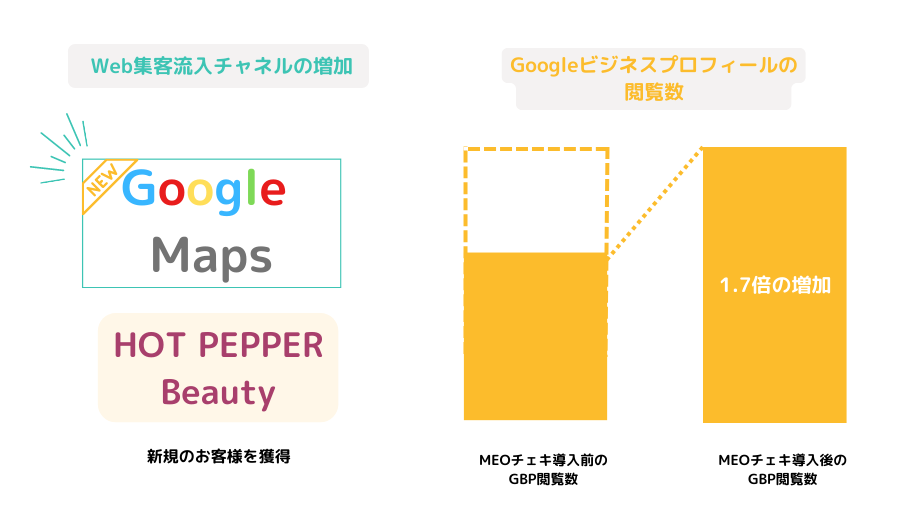 【MEOチェキ導入事例】ホットペッパービューティー以外の集客流入チャネルを増やすことに成功!少ない運用工数でGoogleビジネスプロフィールの閲覧数が1.3~1.7倍に増加!!