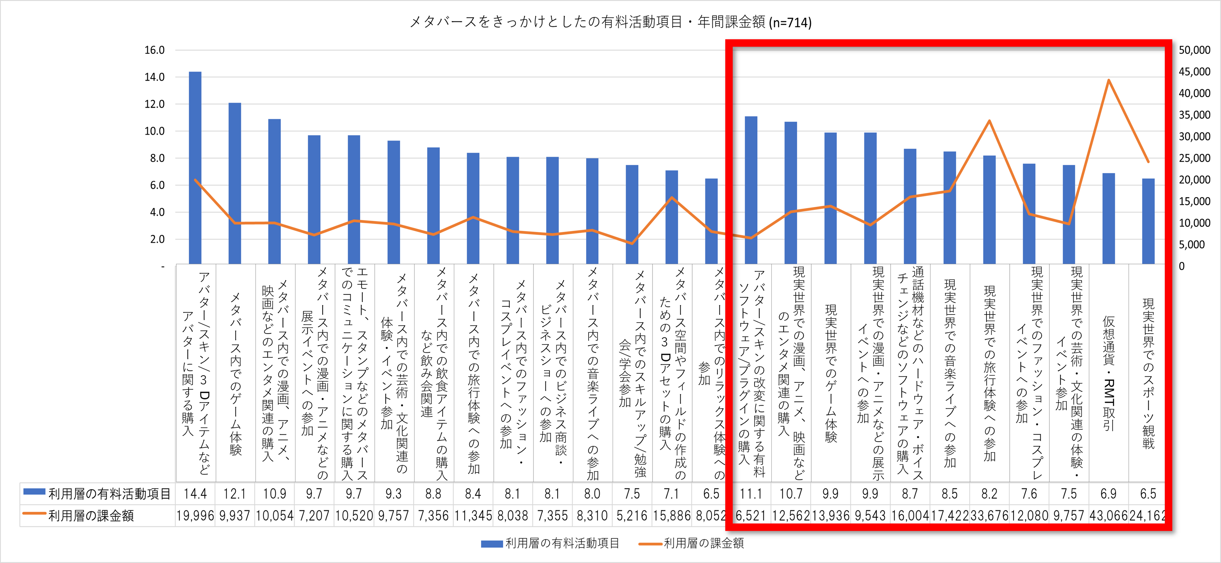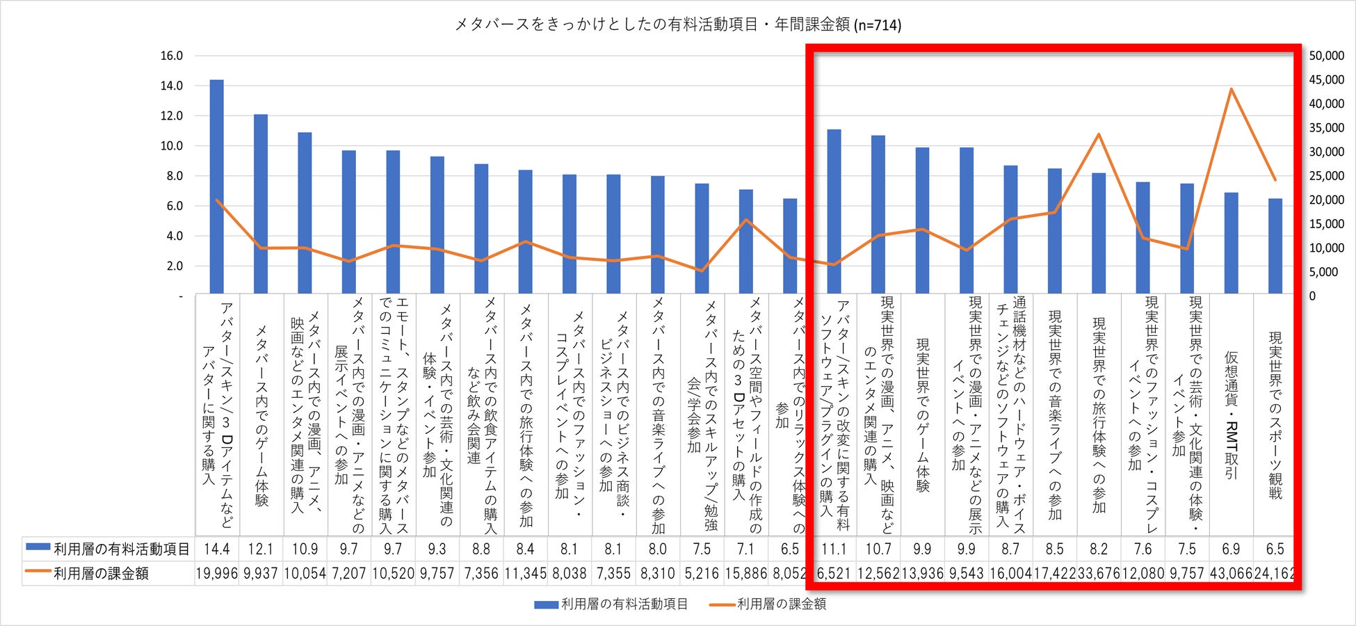 メタバース利用層は、メタバースでの活動をきっかけにメタバース空間内だけでなく、現実世界でも消費行動を行っており、ジャンルによっては現実世界での課金額が非常に高いことが窺えます。