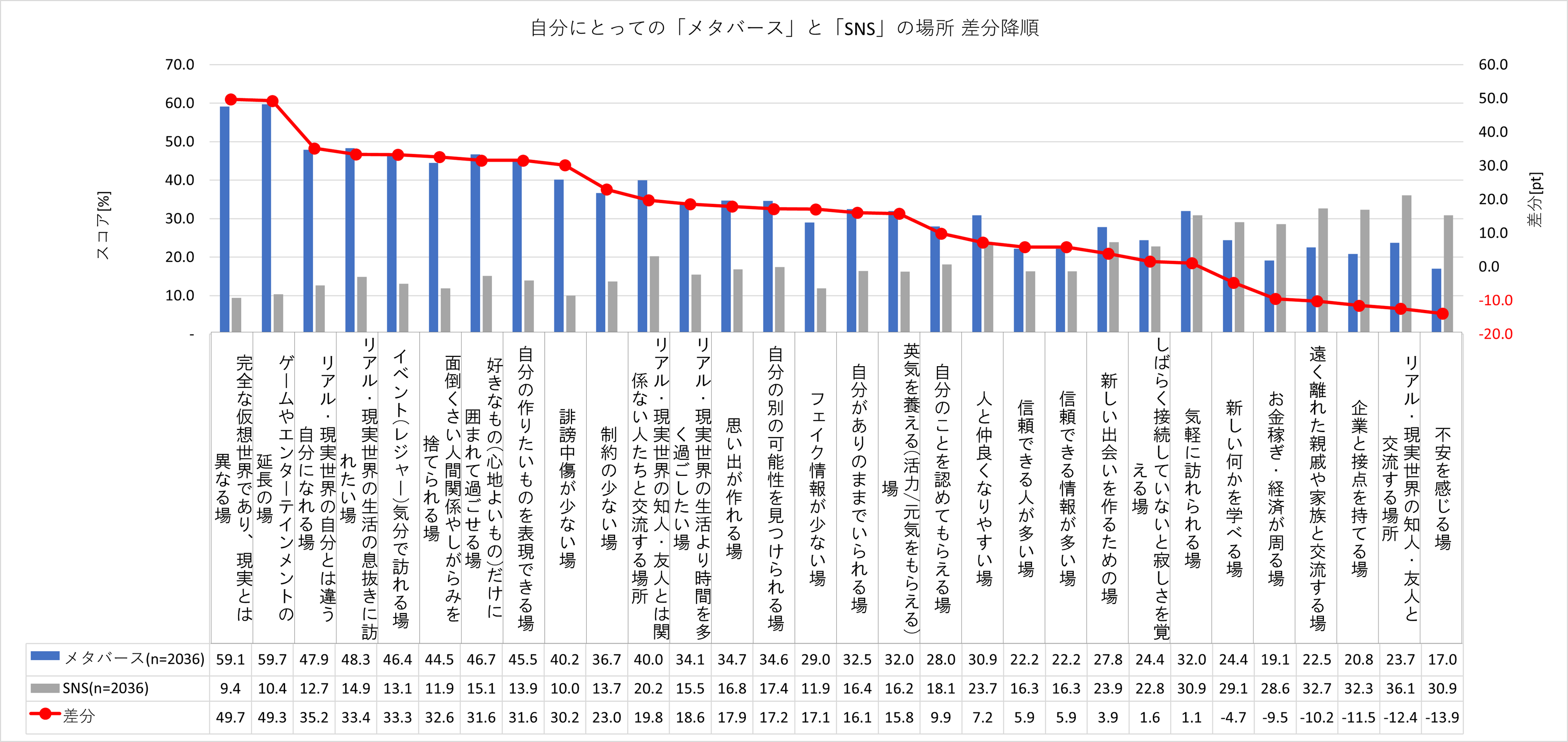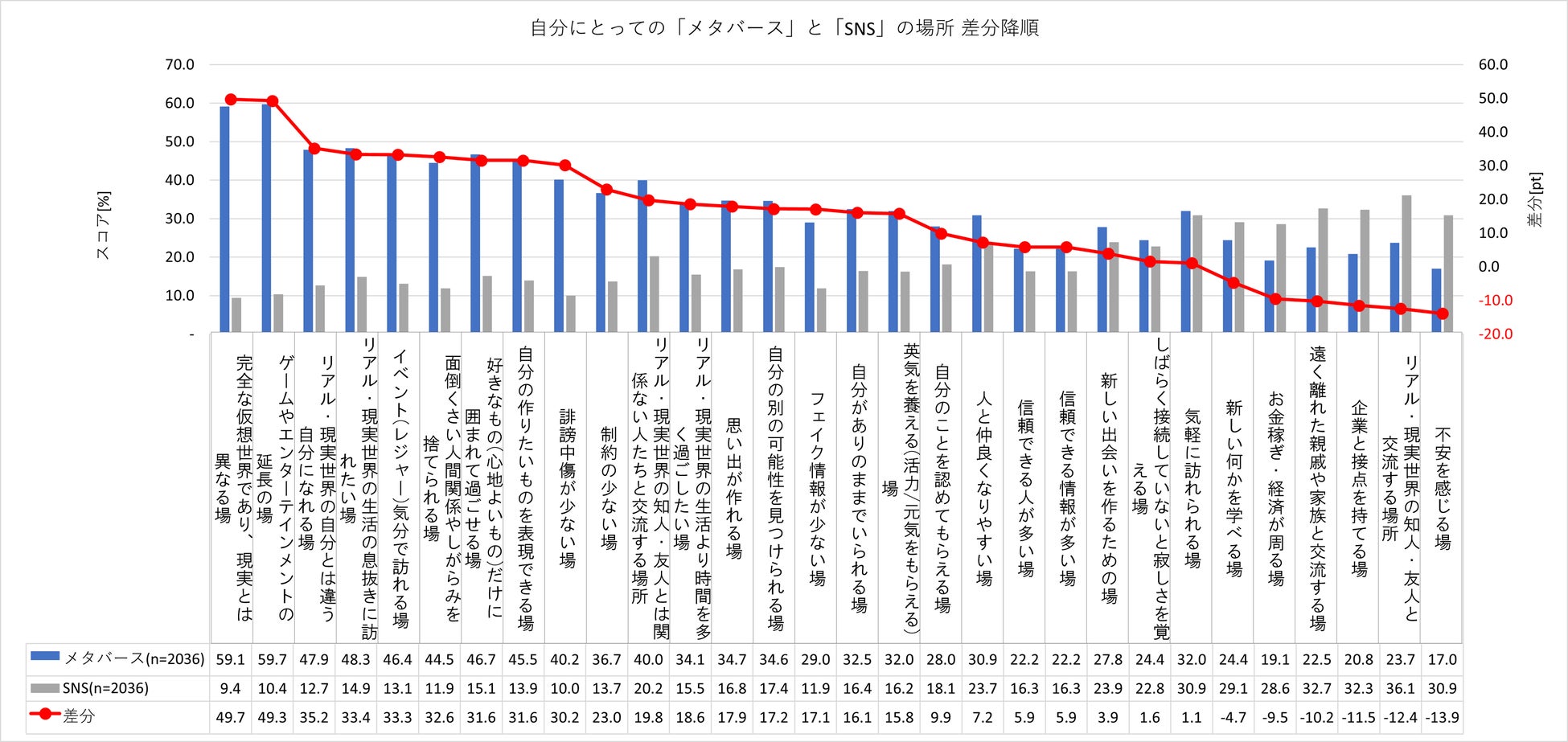また、メタバース認知層(興味層・利用層含む)に、SNSとメタバースの存在を比較すると、役割の違いについても明らかになりました。SNSは「現実の知人・友人との交流の場(36.1%)」「遠く離れた知人・家族と交流する場(32.7%)」である一方、「不安を感じる場(30.9%)」のスコアが相対的に高い傾向にあります。対してメタバースは、「完全な仮想世界であり、現実とは異なる場(59.1%)」、「ゲームやエンターテインメントの延長の場(59.7%)」「現実世界の生活の息抜きに訪れたい場(48.3%)」 「自分の作りたいものを表現できる場(45.5%))」として認識されており、SNSと比較すると生活者にとって「エンタメの延長としての場所や自己表現もできる解放の場所」として機能しています。
