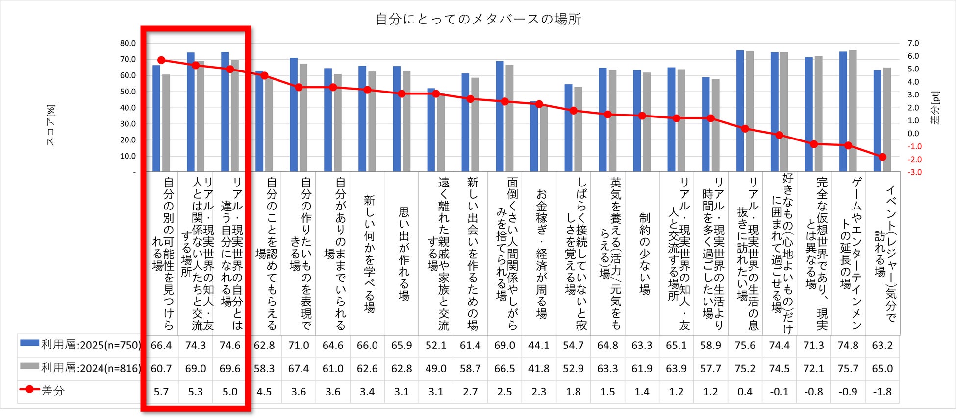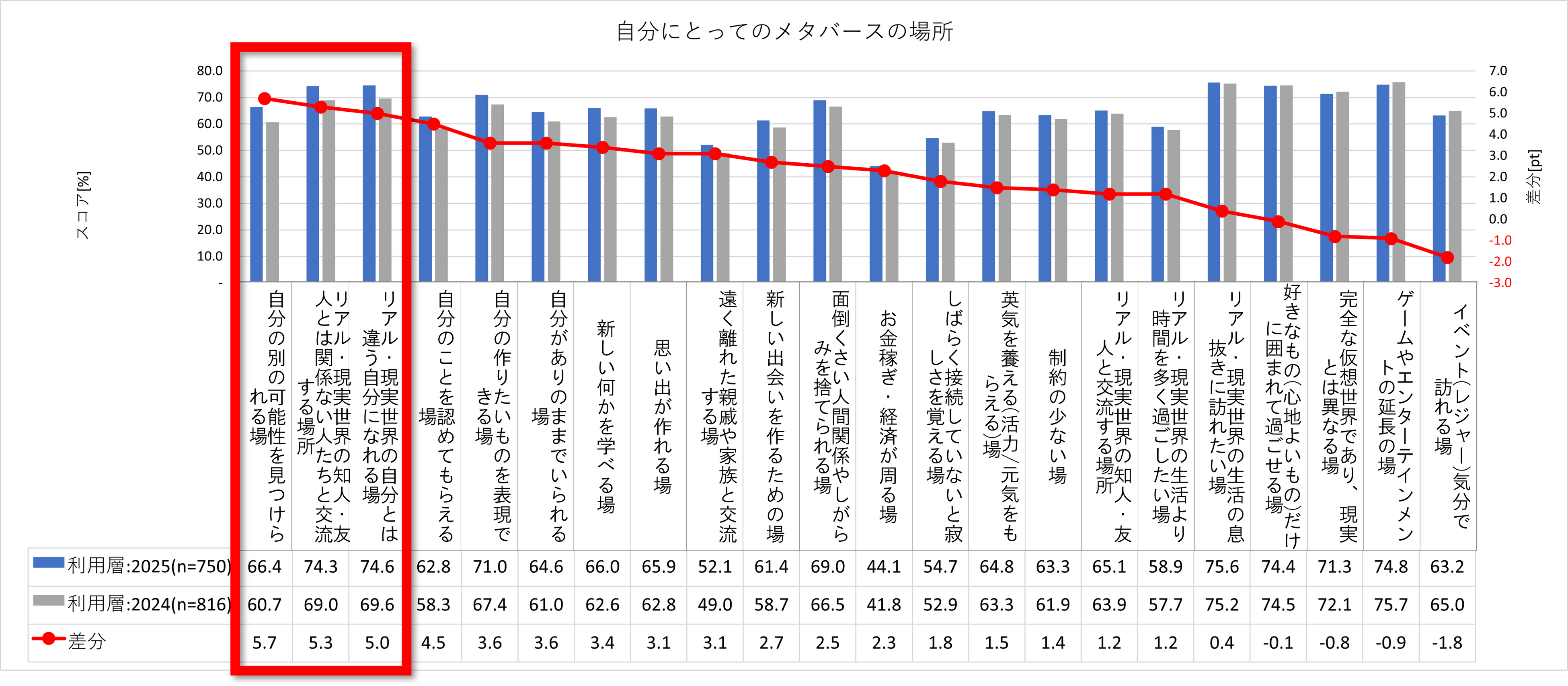 「自分にとってのメタバースの存在」について経年で比較したところ、「自分の別の可能性を見つけられる場」が66.4%(+5.7pt)、「現実世界の自分とは違う自分になれる場」が74.6%(+5.0pt)と上昇しました。「リアル・現実世界の知人・友人とは関係ない人たちと交流する場所」も74.3%(+5.3pt)と上昇しており、メタバースで出会った人たちとの交流や活動が、新たな自分の可能性の発見につながっていることが示唆されました。