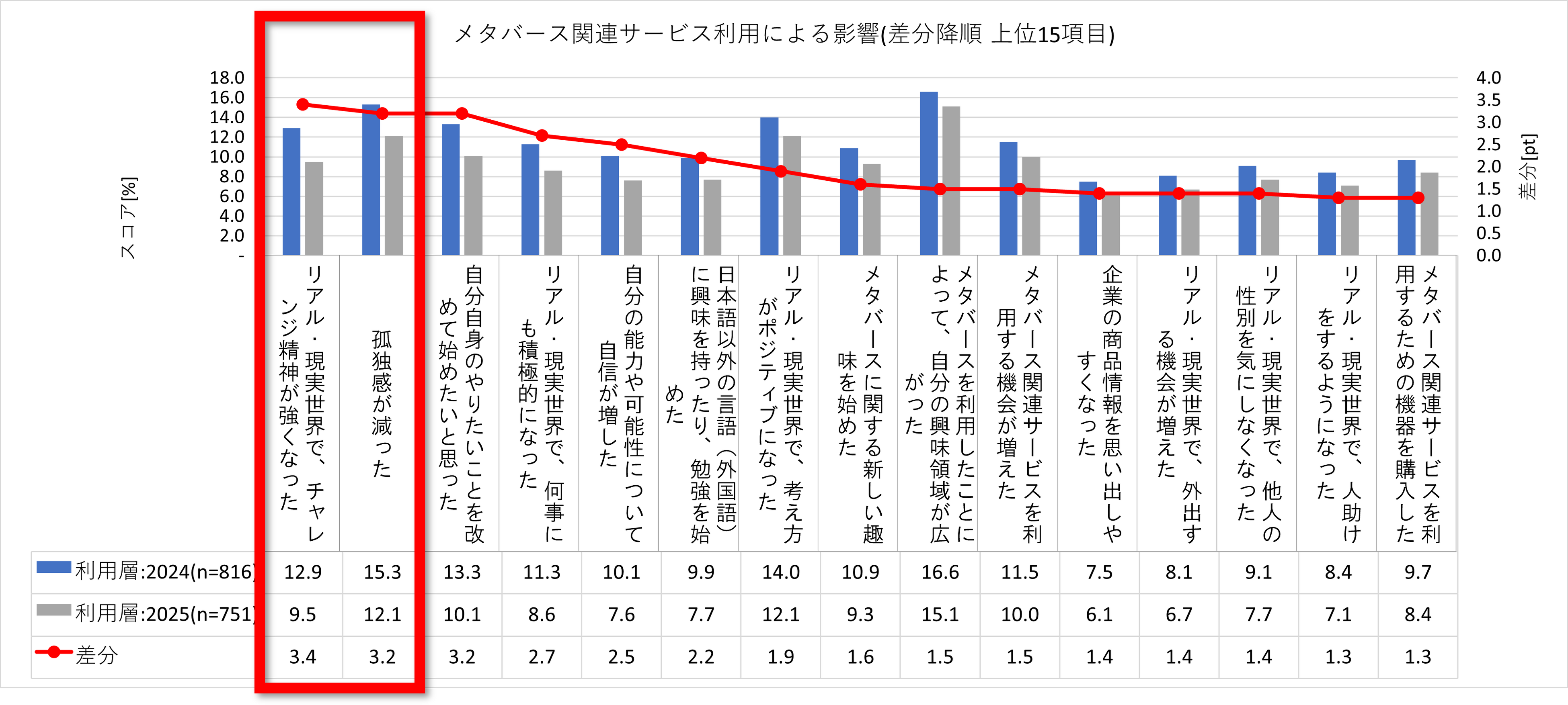メタバースサービスが利用者に与えた影響を経年で比較したところ、「孤独感が減った」という回答は利用層全体で15.3%となり、前年(12.1%)から3.2ポイント増加しました。また、「リアル・現実世界がポジティブになった(+1.9pt)」といった項目もやや伸長しており、メタバースは単なる現実逃避の場ではなく、現実生活の精神的な安定を支える「心のインフラの場」として機能し始めています。さらに、「リアル・現実世界で、チャレンジ精神が強くなった」という回答は12.9%で前年から3.4ptスコアが増加しました。また、「自分自身のやりたいことを改めて始めたいと思った」も3.2pt増加しており、メタバースでの経験が現実世界での積極的な行動につながっている様子がうかがえます。