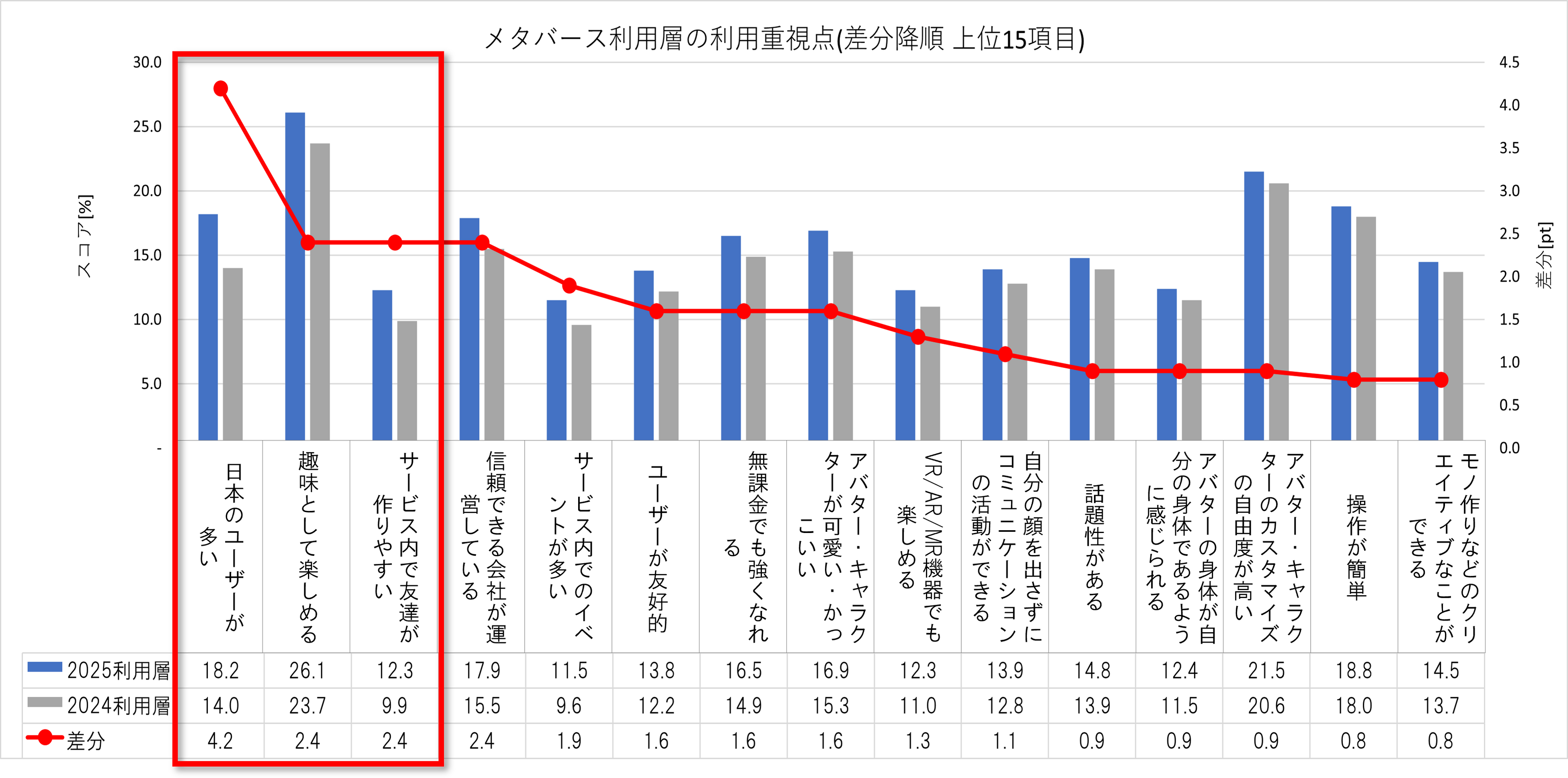メタバース利用層の利用重視点では前年と比較して、「日本のユーザーが多い:18.2%(+4.2pt)」や「趣味として楽しめる:26.1%(+2.4pt)」、「サービス内で友達が作りやすい:12.3%(+2.4pt)」が伸長しました。”メタバース”では、様々な国籍のユーザーが集い、デジタルな肉体(スキン)を使って、共通の動作(エモート)を行うことで「グローバルな友達作りやコミュニケーション(異文化への出会い)」、「仮想現実への冒険」ができる場として注目されていましたが、現状日本国内では「日本語で友達作りができる日常空間」としての実用性を求め始めていることが窺えます。 一方で、AIによるリアリタイム翻訳の一般化によって、メタバース空間でのグローバルコミュニケーションが増加することを考慮すると、本傾向は今後変わる可能性が考えられます。
