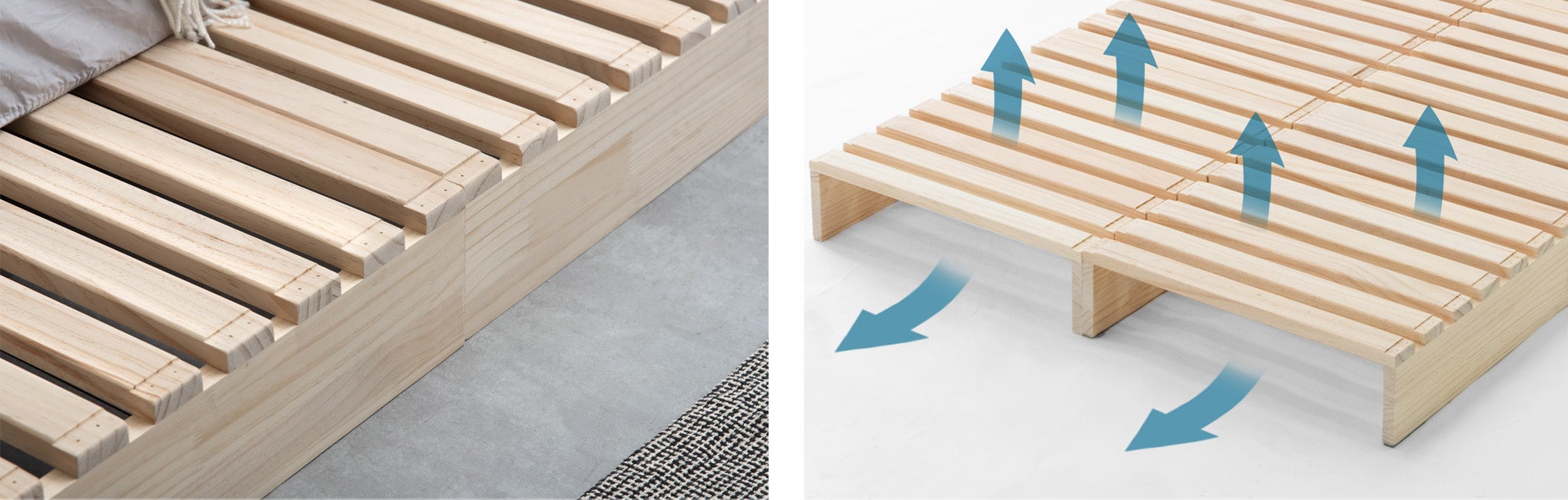 さらに、パイン材は湿気に強く通気性に優れていることに加え、パレットがすのこ状になっているので梅雨時期のジメジメや寝汗がこもりにくい構造となっています。