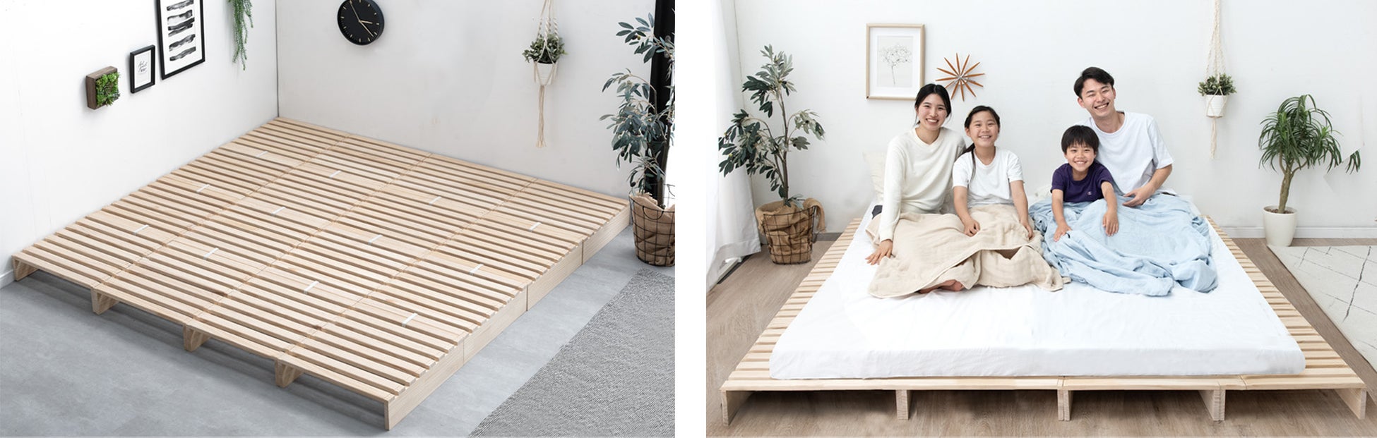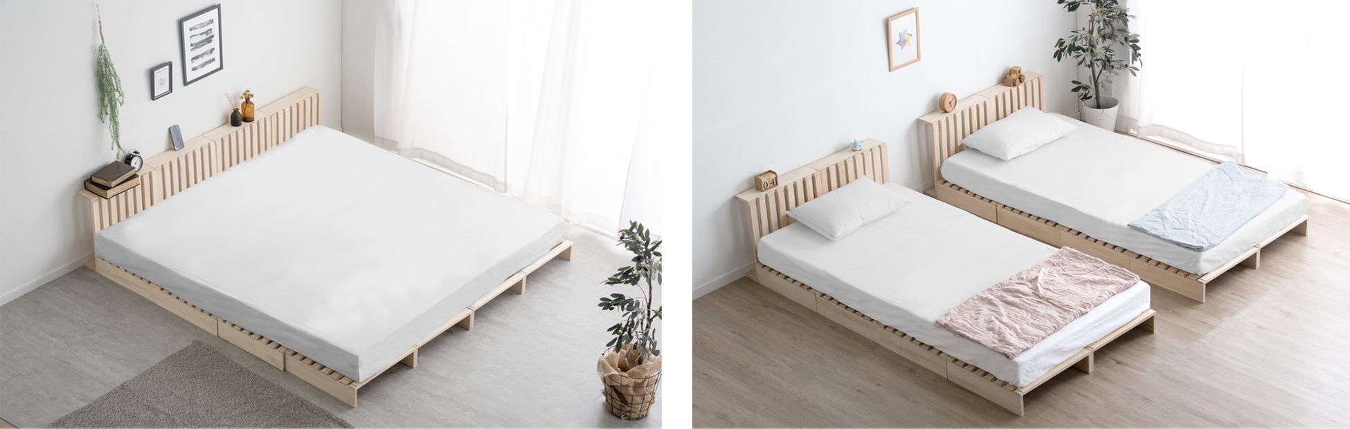 幼少期は必要なパレット枚数を連結して家族全員で寝れるファミリーベッドとして活用でき、お子様の成長に合わせてファミリーベッドをシングルベッド2台に分けて各自のお部屋でお使いいただくことも可能です。