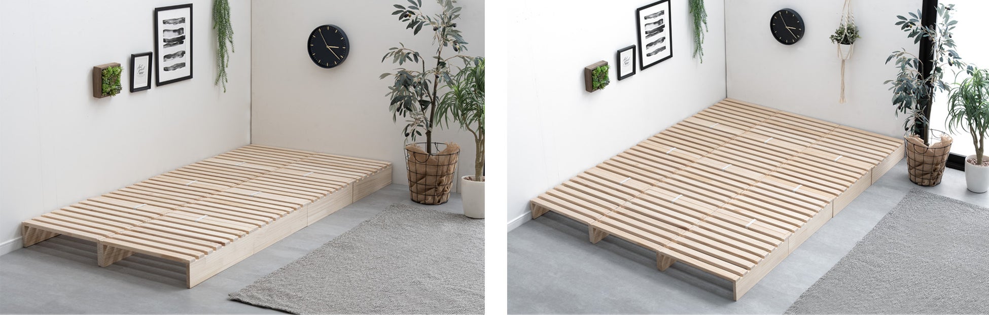 パレットの枚数を調整することでお部屋の広さや人数に合わせて自由に組み替えができ、自分好みのベッドフレームにアレンジすることができます。