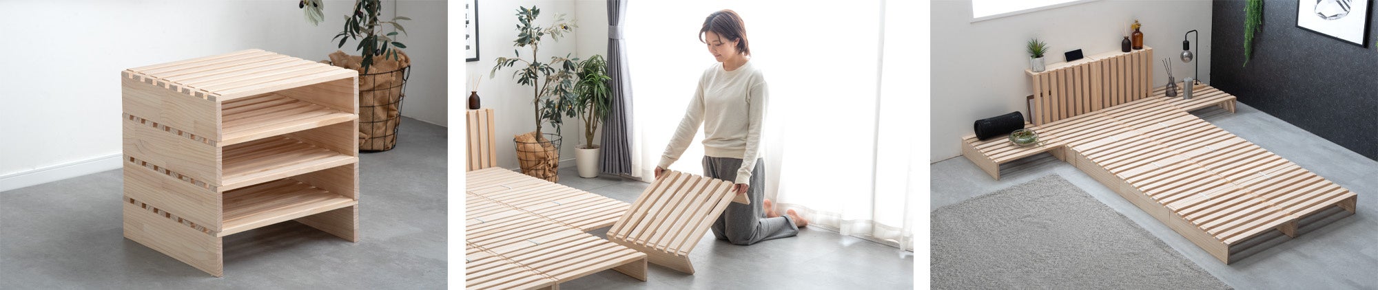 自由にベッドフレームを組み替えられるパレットベッドは本店サイトと楽天市場店にて取り扱いを開始しております。詳細は販売ページをご確認ください。