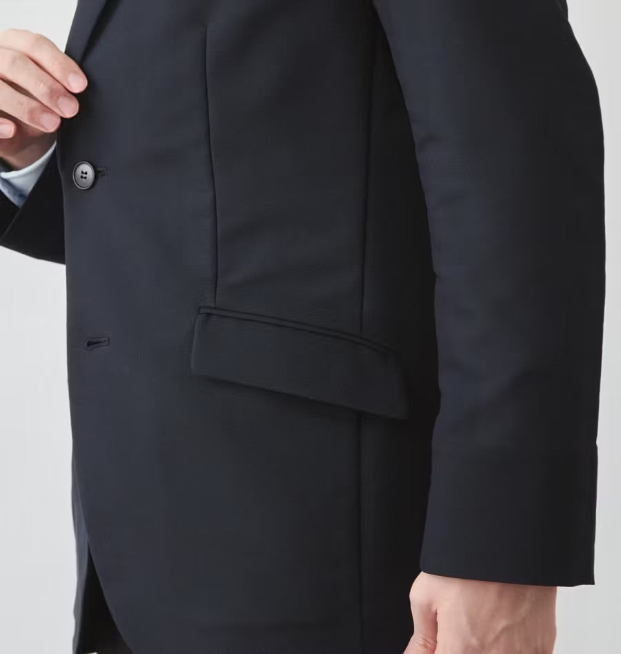③本格的テーラードジャケット仕立て。斜めの「スラントポケット」でスタイリッシュ