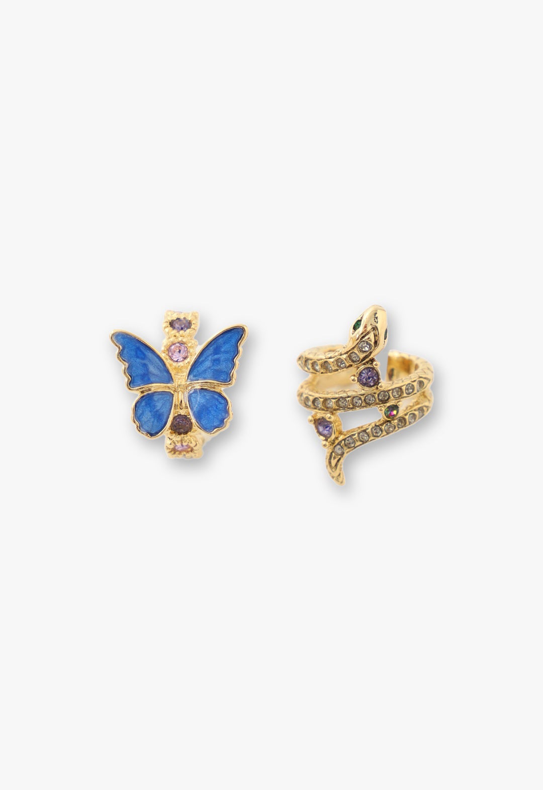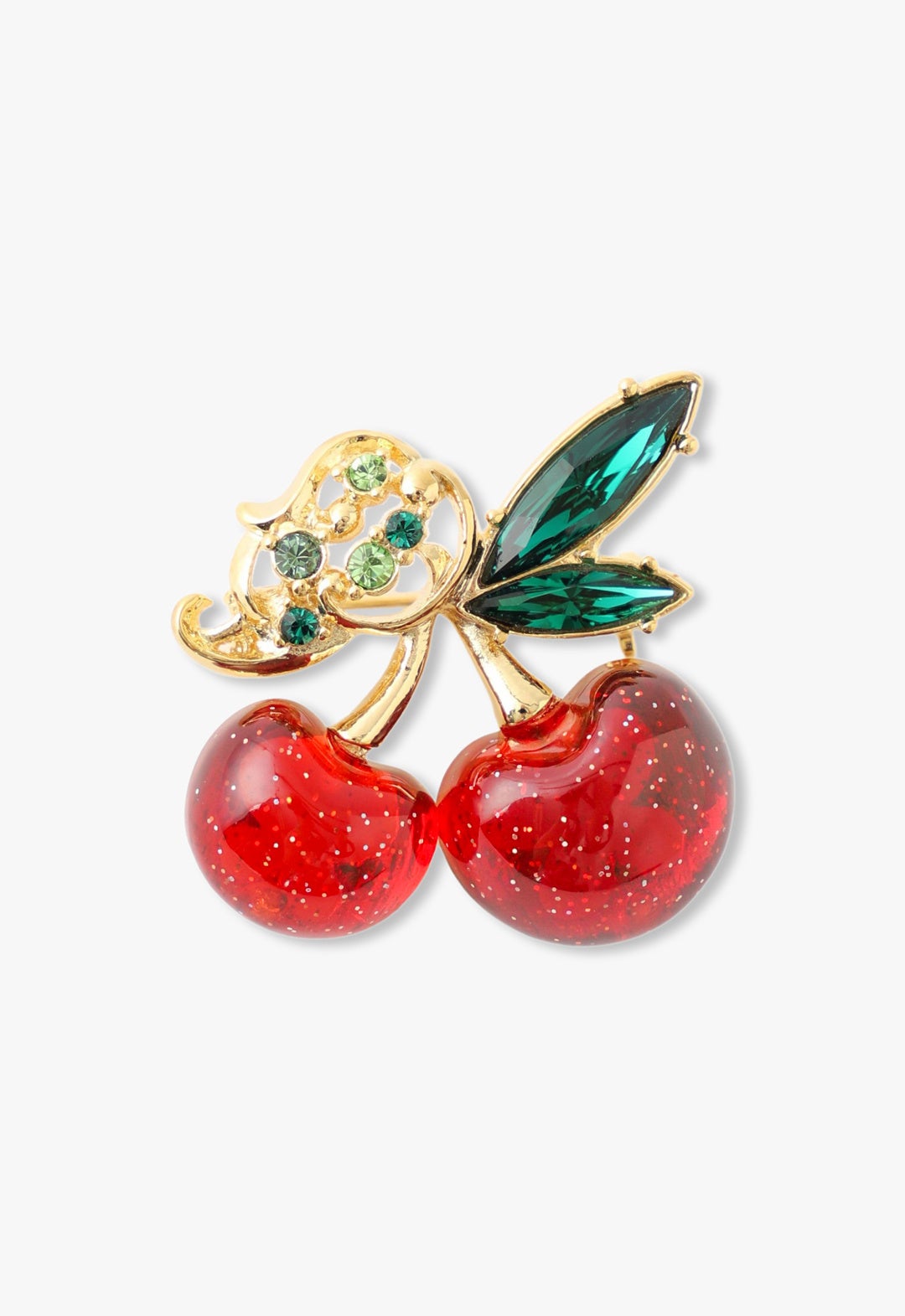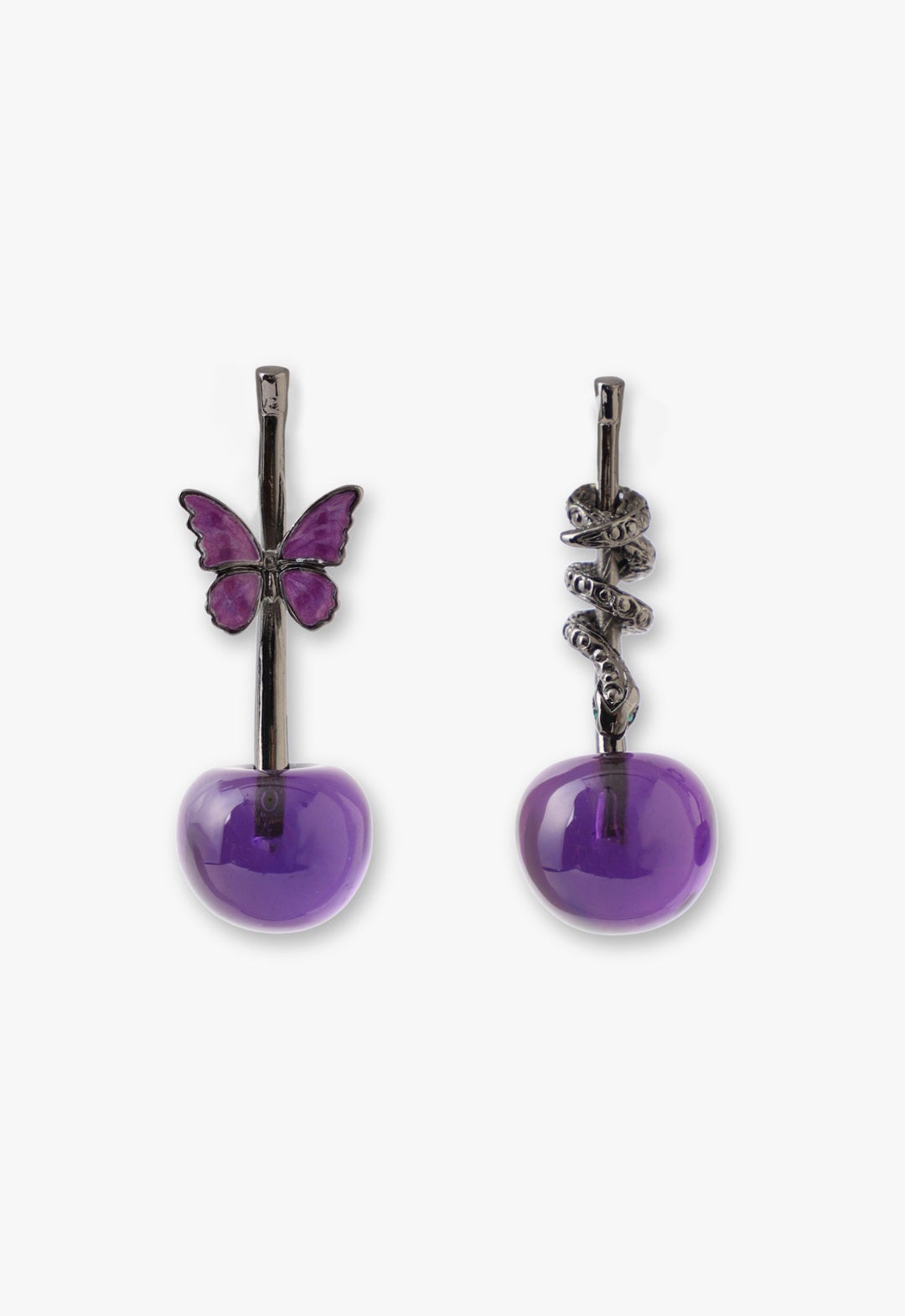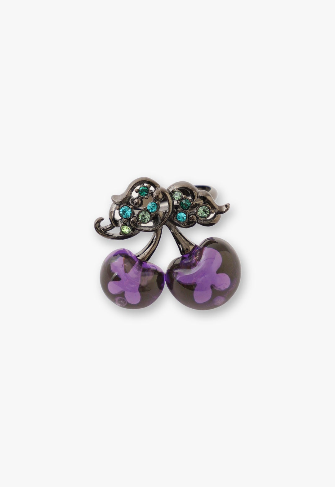 ぷっくりとした艶やかな実を樹脂で表現し、揺れる葉っぱにカットガラス、エポキシカラーの蝶などを組み合わせたANNA SUIらしいデザイン。