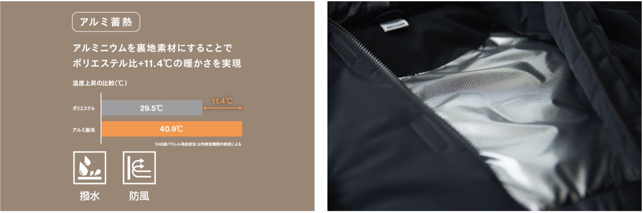 「アルミ蓄熱シリーズ」では、全ての裏地にアルミ蓄熱素材を使用。アルミ蓄熱素材は、通常のポリエステル素材の裏地と比較して11.4℃の温度上昇の優位性を誇っており(※1)保温性に優れています。さらに表地には、防風機能も採用しており、熱を逃がしづらく、温かさを保つことが可能です。また、表素材は撥水加工をしているため、突然の雪や雨などにも安心して着用いただけます。さらに、軽量性にも優れているため、冬に負けない暖かさと、着心地の良さを実現しました。シンプルなデザインで使い勝手が良いため、着用シーンや老若男女を問わず様々な方に着用いただけます。