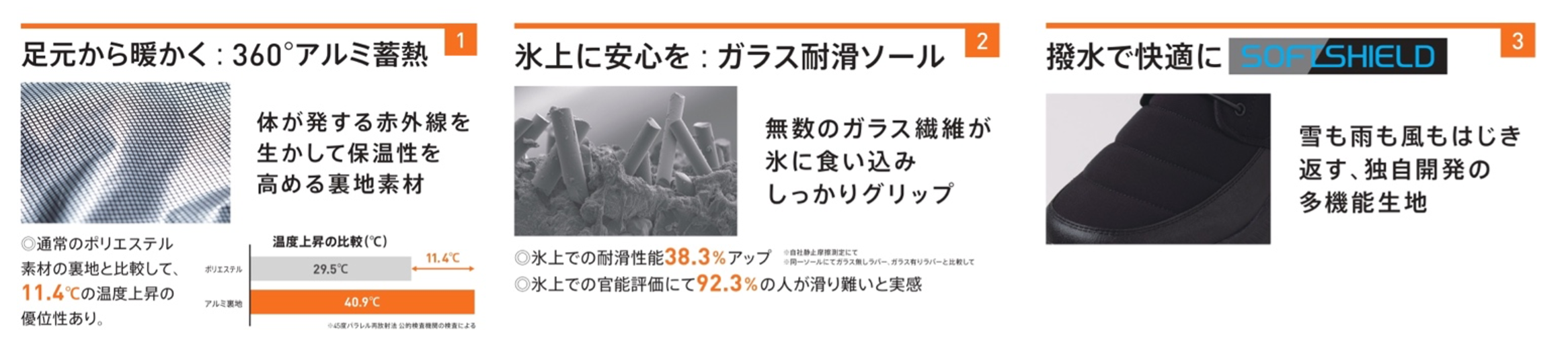 昨シーズン、販売開始後約2か月でサイズ切れが続出したヒット商品、 「アルミ蓄熱シューズ」がこの度、機能をアップデートして登場。裏地にはアルミ蓄熱素材を使用しており、アルミ蓄熱素材の体が発する赤外線を生かして保温性を高める機能で高い保温性を実現いたしました。また、ガラス繊維を配合したラバーソールを採用し、氷上での耐滑性能が38.3%アップ(※2)しました。さらに、低反発のインソールを採用しているため、足裏に優しくフィットし長時間履き続けても疲れにくさを実感いただけます。また表地にはアルペン独自開発した多機能生地「SOFTSHIELD」を採用しており、雪や雨、風も弾き返すことができ快適にお過ごしいただけます。