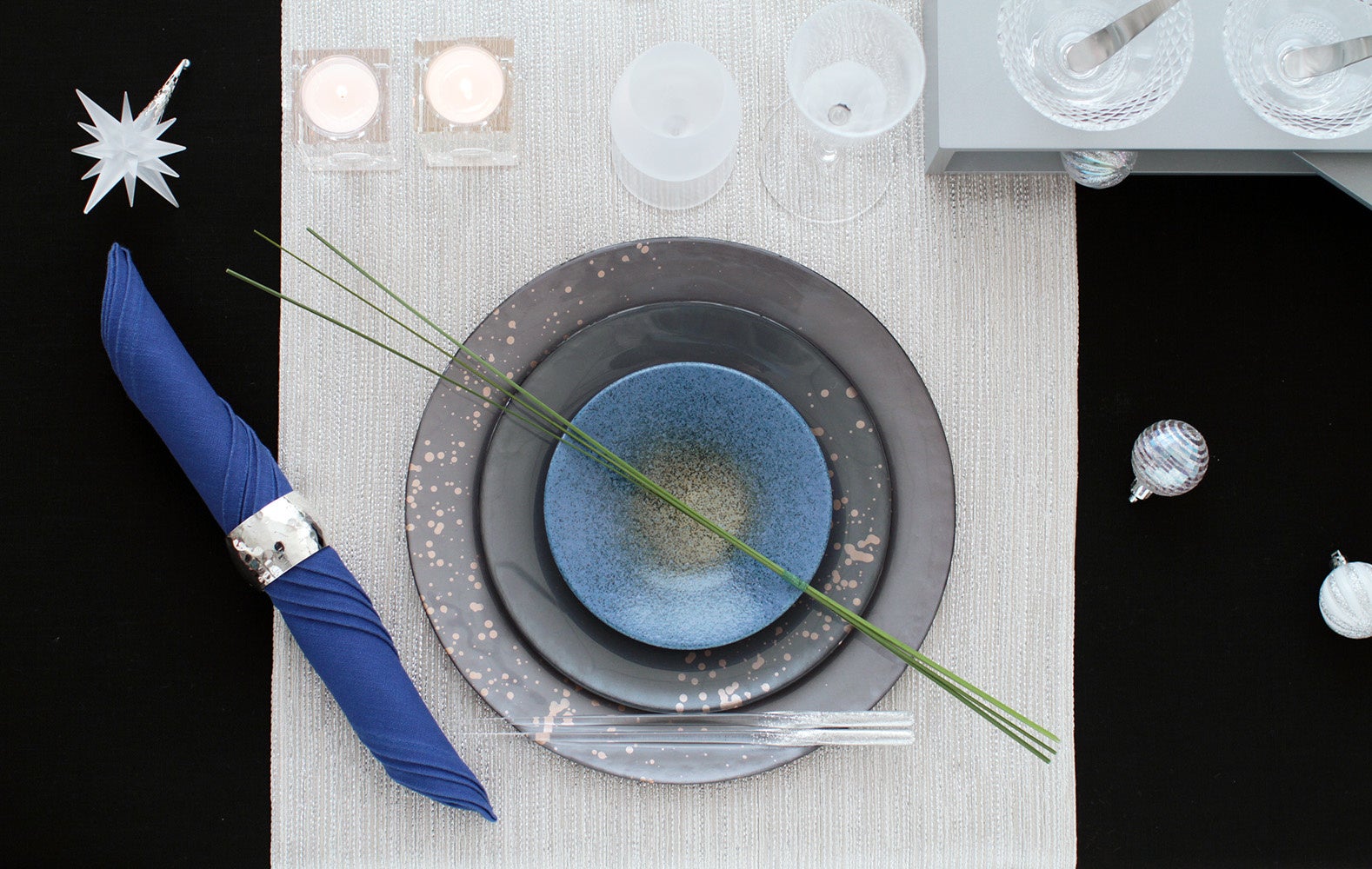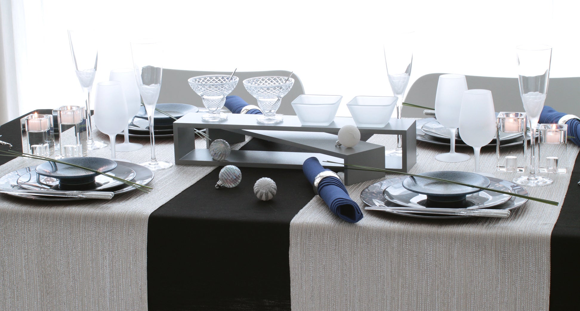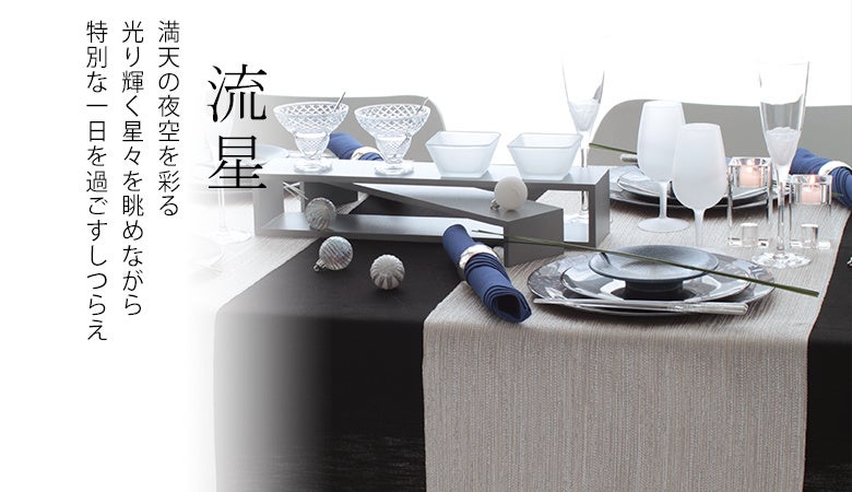 ご提案する2つのコーディネートには、どちらもラメ糸を織り込んだランナー「リュウセイ(シルバー)」とガラス器を使用しており、キラキラ輝く夜空をイメージしています。
