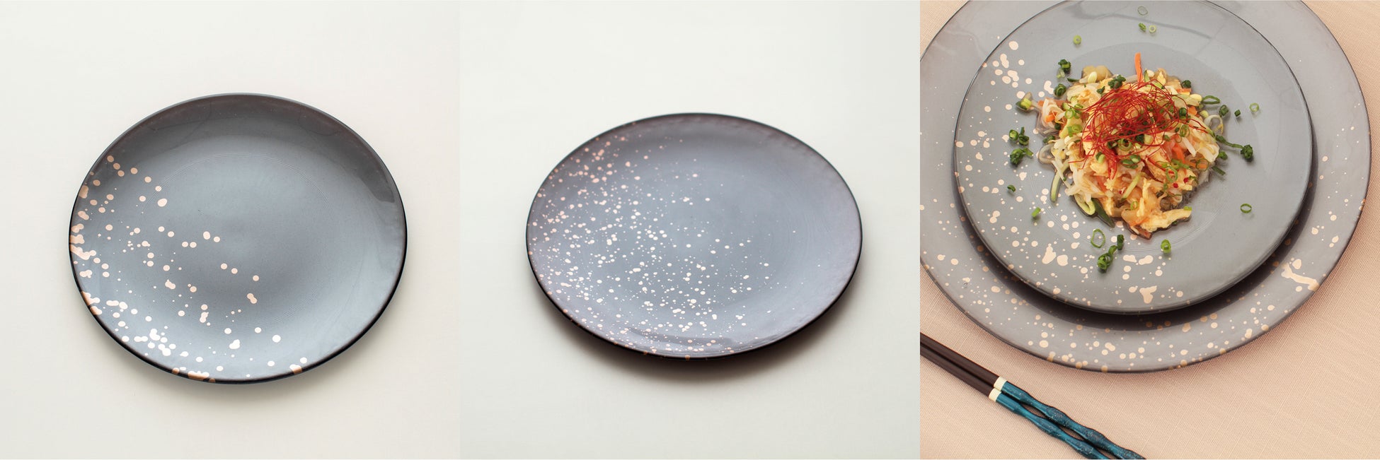 グレーをベースにして、全体の一部をゴールド系のカラーの塗料を吹き付けたデザイン。星空にも天の川のようにも見えるガラスプレートは、シックでモダンな印象です。サラダやデザート皿としてお使いできます。また、同じ柄でサイズ違いの2つを組み合わせてコーディネートできます。クリスマス時期にも華やかでおすすめです。