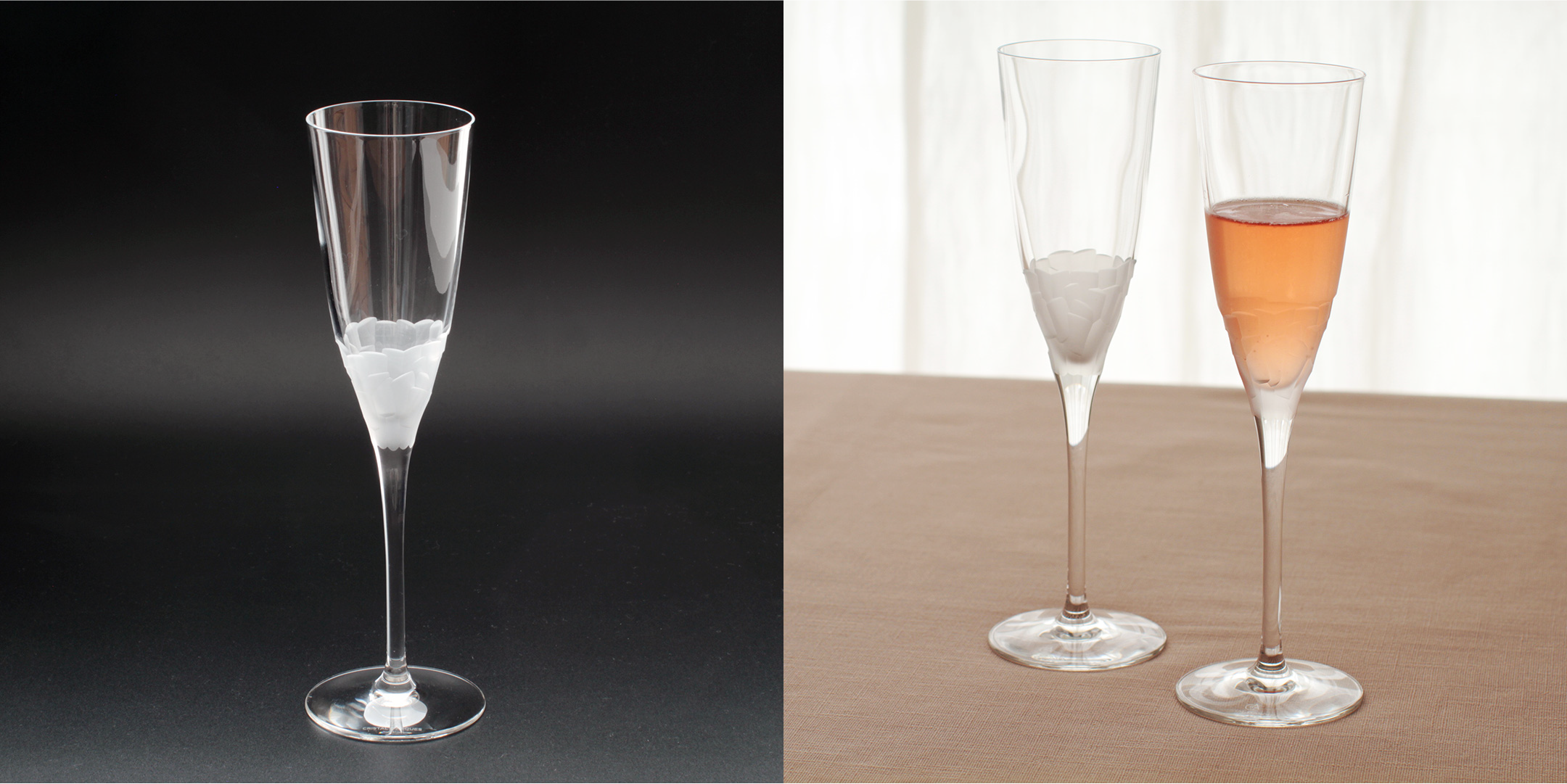 グラスの下部に重なる雪の結晶のようなフロスト模様が施されたおしゃれなフォルムです。スパークリングワインなどの飲み物を注ぐと2層になる姿がとても優雅な印象です。