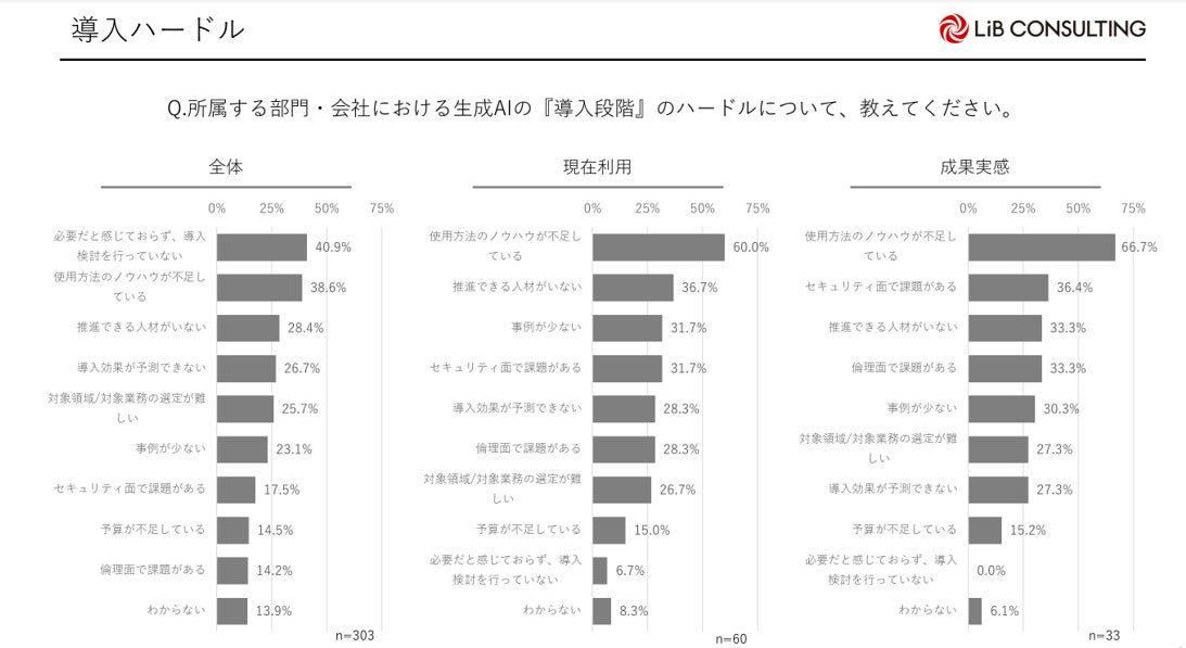 所属する部門・会社において生成AIの導入ハードルは、「必要と認識しておらず導入検討を行っていない(40.9%)」であり、業務と生成AIの関連性を認識できていないことが要因だと考える。「セキュリティ面の課題がある(17.5%)」となっておりセキュリティ上のハードルは低い。また、利用層では「使用方法のノウハウが不足している(60.0%)」がトップである。