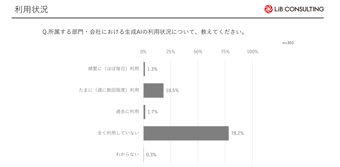 「ChatGPT」など生成AIを業務で「頻繁に(ほぼ毎日)利用(1.3%)」、「たまに(週数回程度)利用(18.5%)」と日常利用している層は19.8%、全く利用していない層は78.2%である。