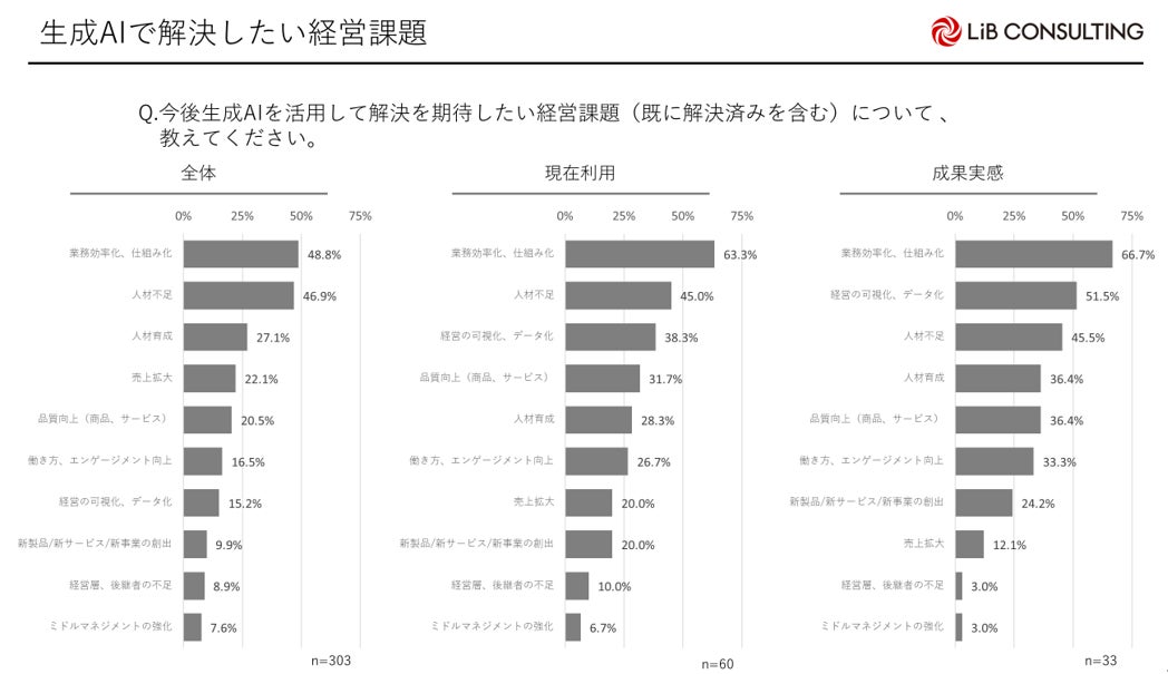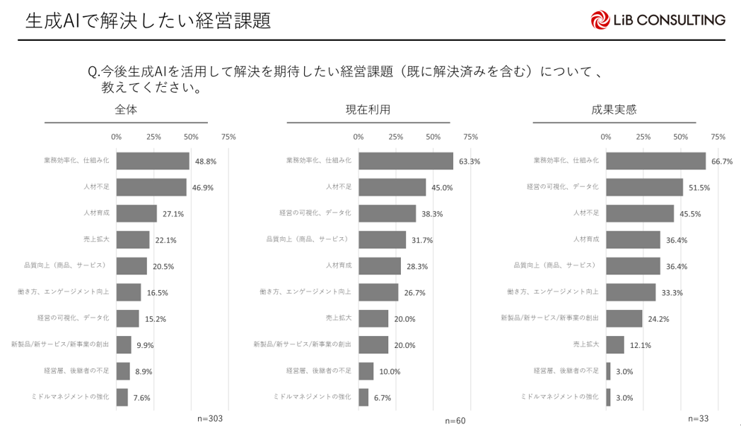 生成AIで解決したい経営課題については「業務効率化/仕組み化」がトップで全体で48.8%、利用層においてで63.3%である。全体と利用層でギャップが現れたのは、「経営の可視化/データ化」で全体で15.2%、利用層で38.3%と23.1%の差がある。