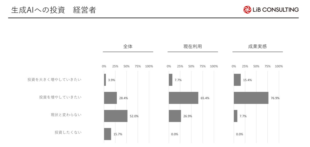 生成AIへの投資に関して利用層は「投資を大きく増やしていきたい(7.7%)」「投資を増やしていきたい(65.4%)」で73.1%となり、すでに生成AIを利用している中堅・中小企業の経営者は生成AIへの投資に積極的である。