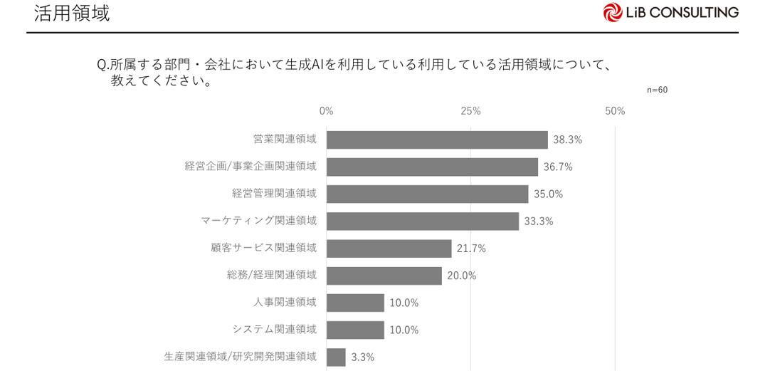所属する部門・会社において生成AIの利用が進んでいる領域は、「営業関連領域(38.3%)」、「経営計画/事業企画関連領域(36.7%)」「経営管理関連領域(35.0%)」「マーケティング関連領域(33.3%)」である。現時点では、バックオフィス領域での活用は進んでいない。